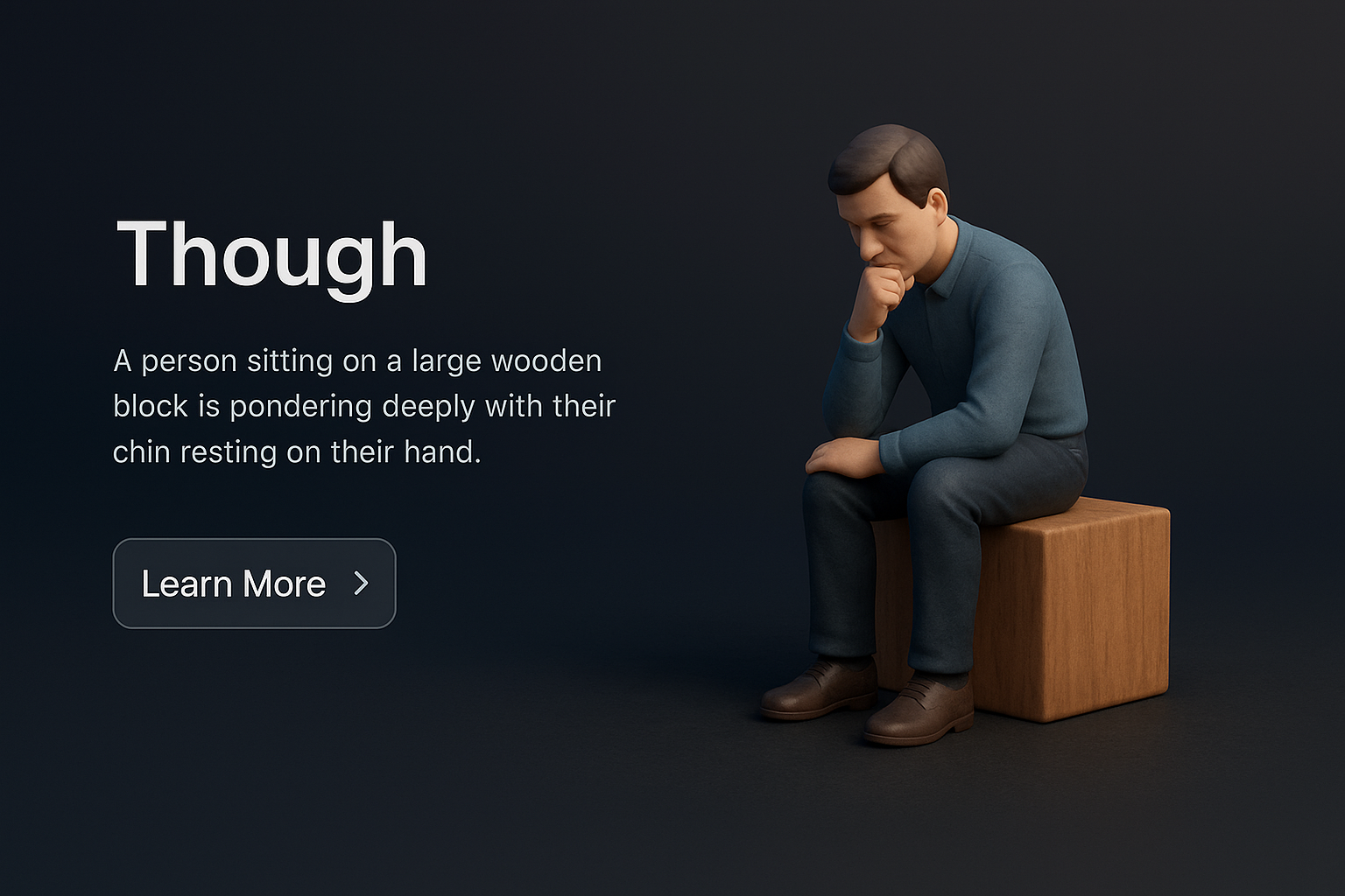 A realistic 3D illustration of a person in thought, seated on a wooden block. The background features a smooth dark gradient, enhancing focus on the figure and text elements.