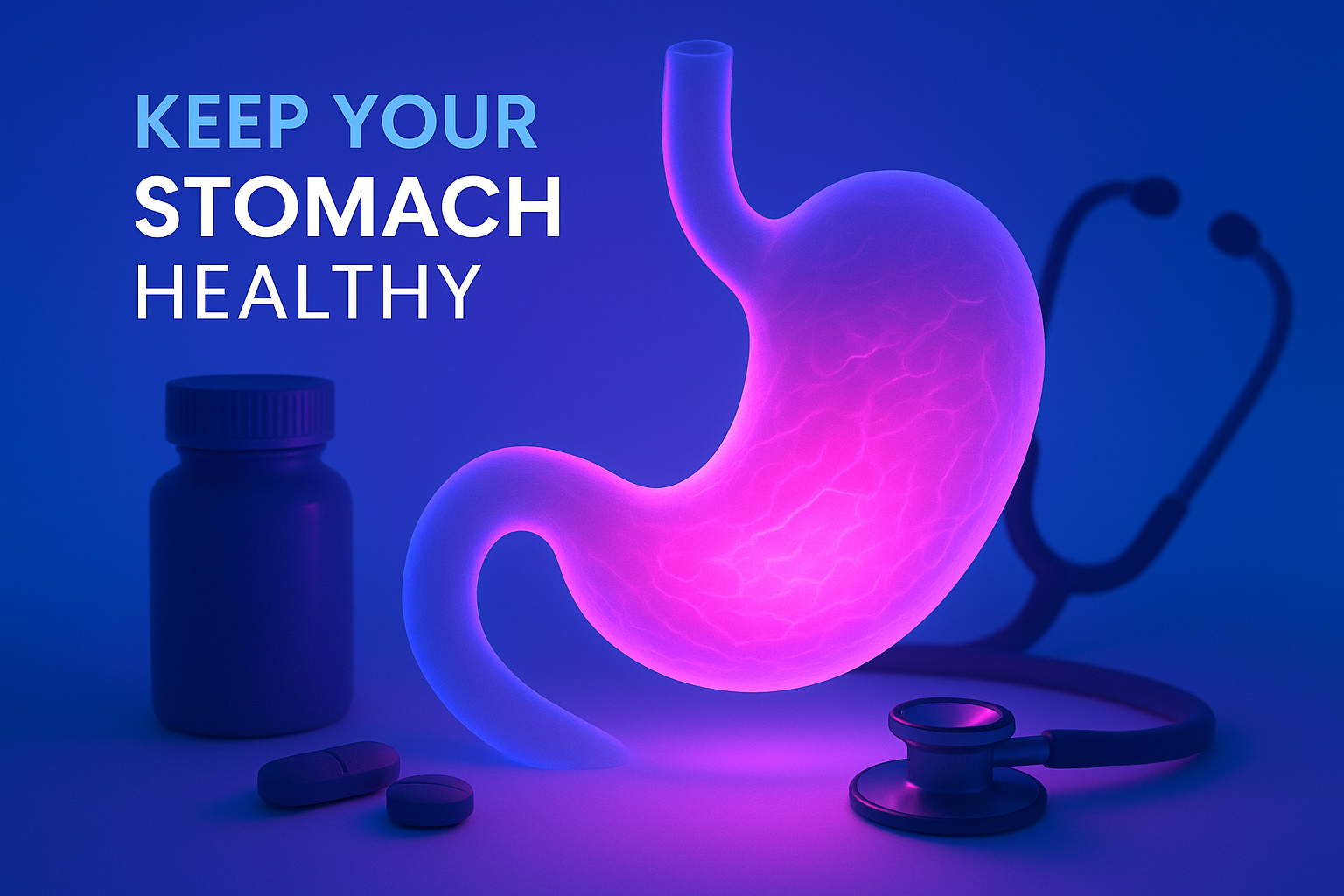 A stylized representation of a glowing stomach in neon pink, surrounded by health-related objects like pills and a stethoscope. The scene is set against a solid blue background, creating a vibrant atmosphere.