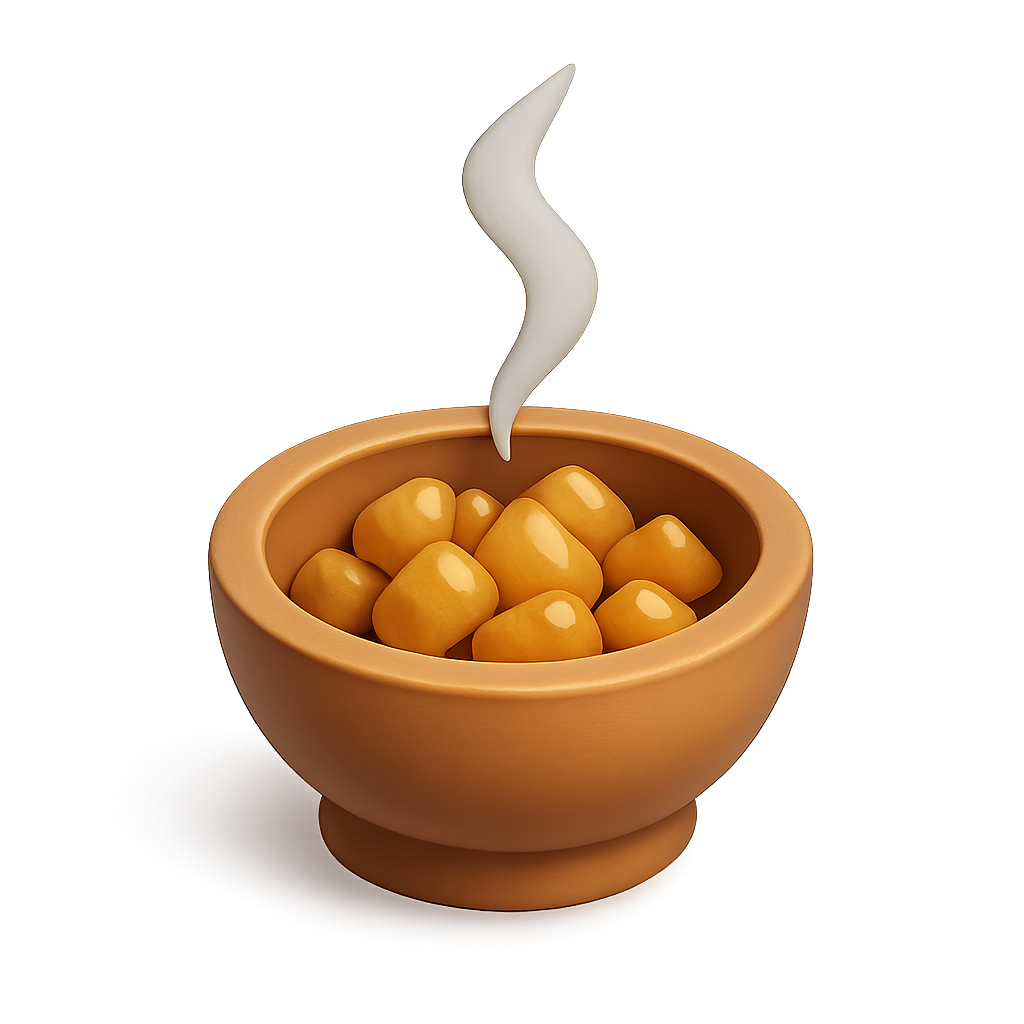 A detailed 3D icon depicting a brown bowl filled with golden, steaming food items. The steam adds a warm touch, enhancing the inviting appearance of the dish.