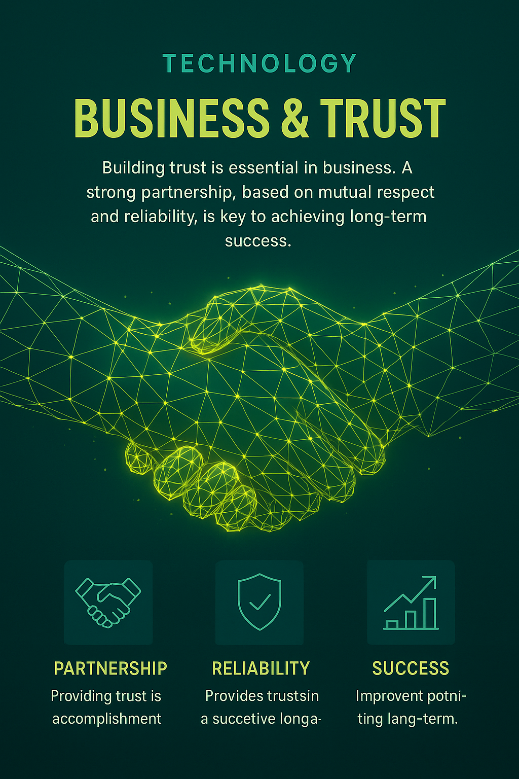 A digital graphic illustrating the theme of business trust, featuring a handshake made of neon lines. Ideal for technology and business presentations.