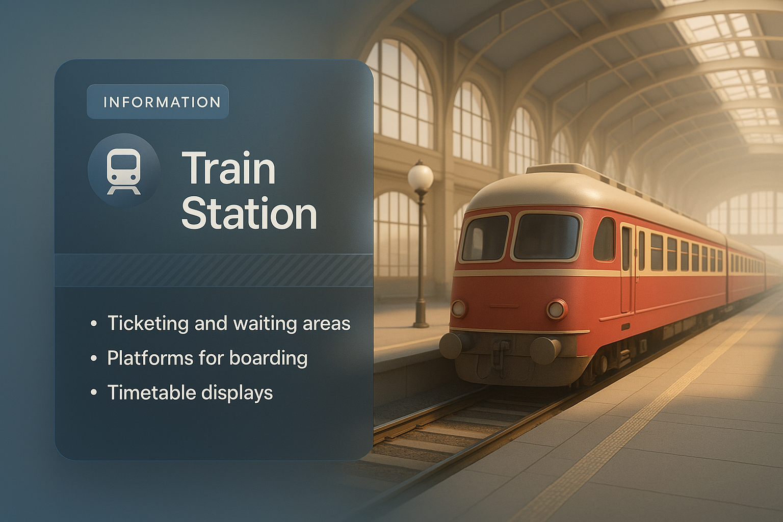 A 3D illustration of a train station featuring a red train and detailed information panels. The design includes a sleek gradient background and a cohesive layout for easy readability.