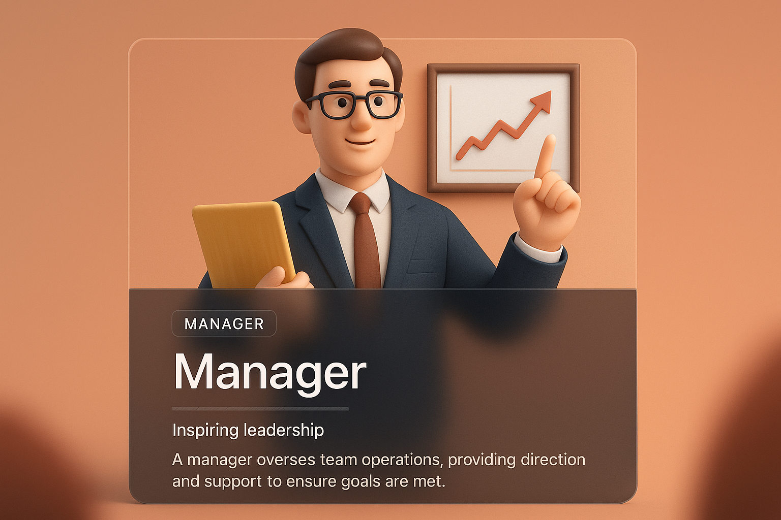 /Collection: /by davooda/Type: PNG/A stylized 3D illustration of a manager holding a tablet, with a graph in the background. The design features a transparent dark panel with text and visual elements.