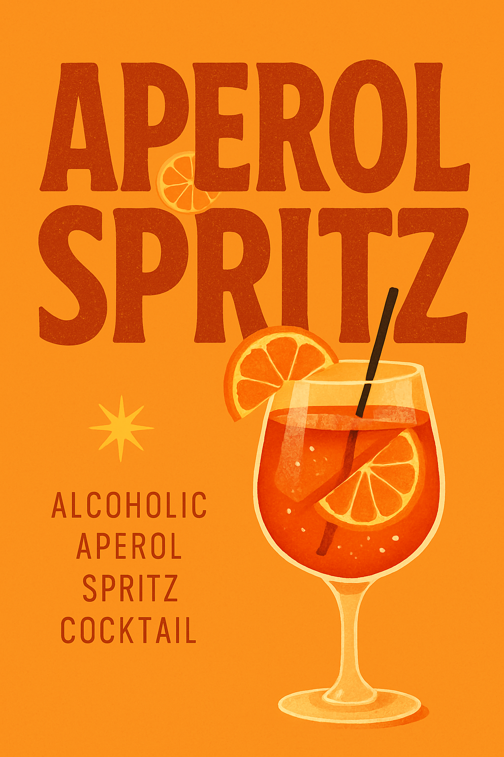 Vibrant graphic showcasing an Aperol Spritz cocktail with bold typography, ideal for beverage promotions or cocktail recipe guides.