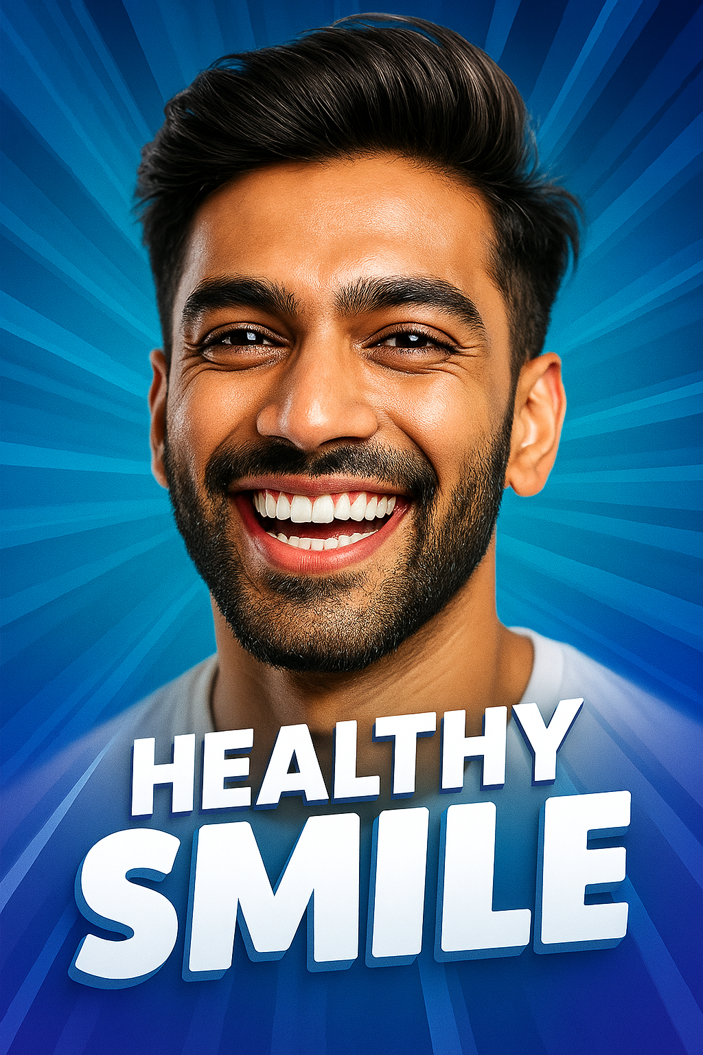 /Collection: /by davooda/Type: PNG/A closeup portrait of a handsome Indian man smiling broadly, showcasing clean teeth. The background features a vibrant blue gradient with dynamic rays, enhancing the ad's appeal.