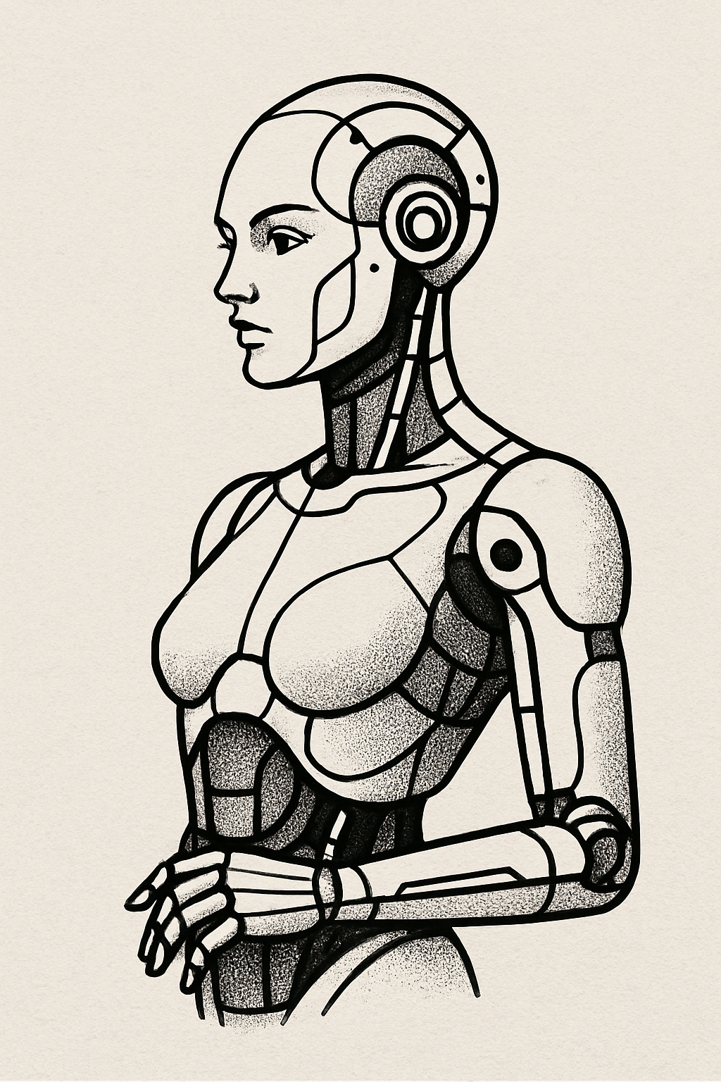 Vintage Illustration of a Female Humanoid Robot with Retro Typography