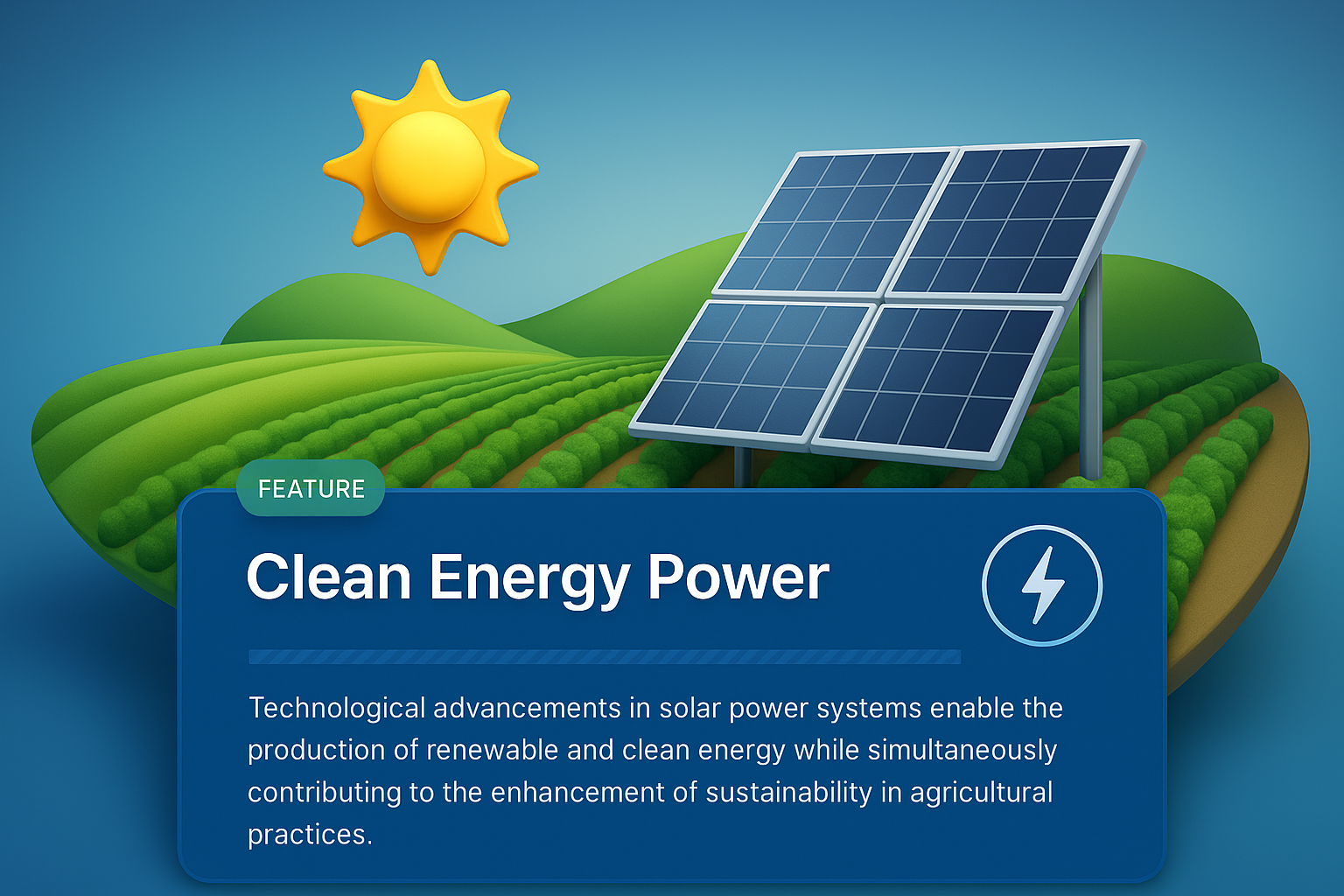 /Collection: /by davooda/Type: PNG/A vibrant 3D illustration showcasing solar panels against rolling green hills, symbolizing the integration of clean energy and sustainable agriculture. The sun shines brightly, highlighting eco-friendly technology.