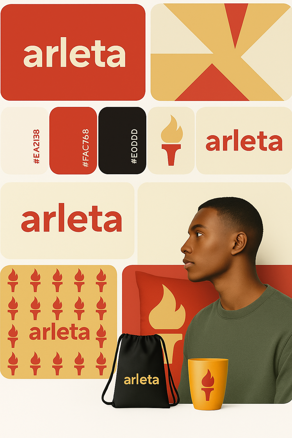 A contemporary brand design featuring a young man alongside various color blocks and products. The palette includes warm tones, showcasing a refreshed logo and thematic elements.