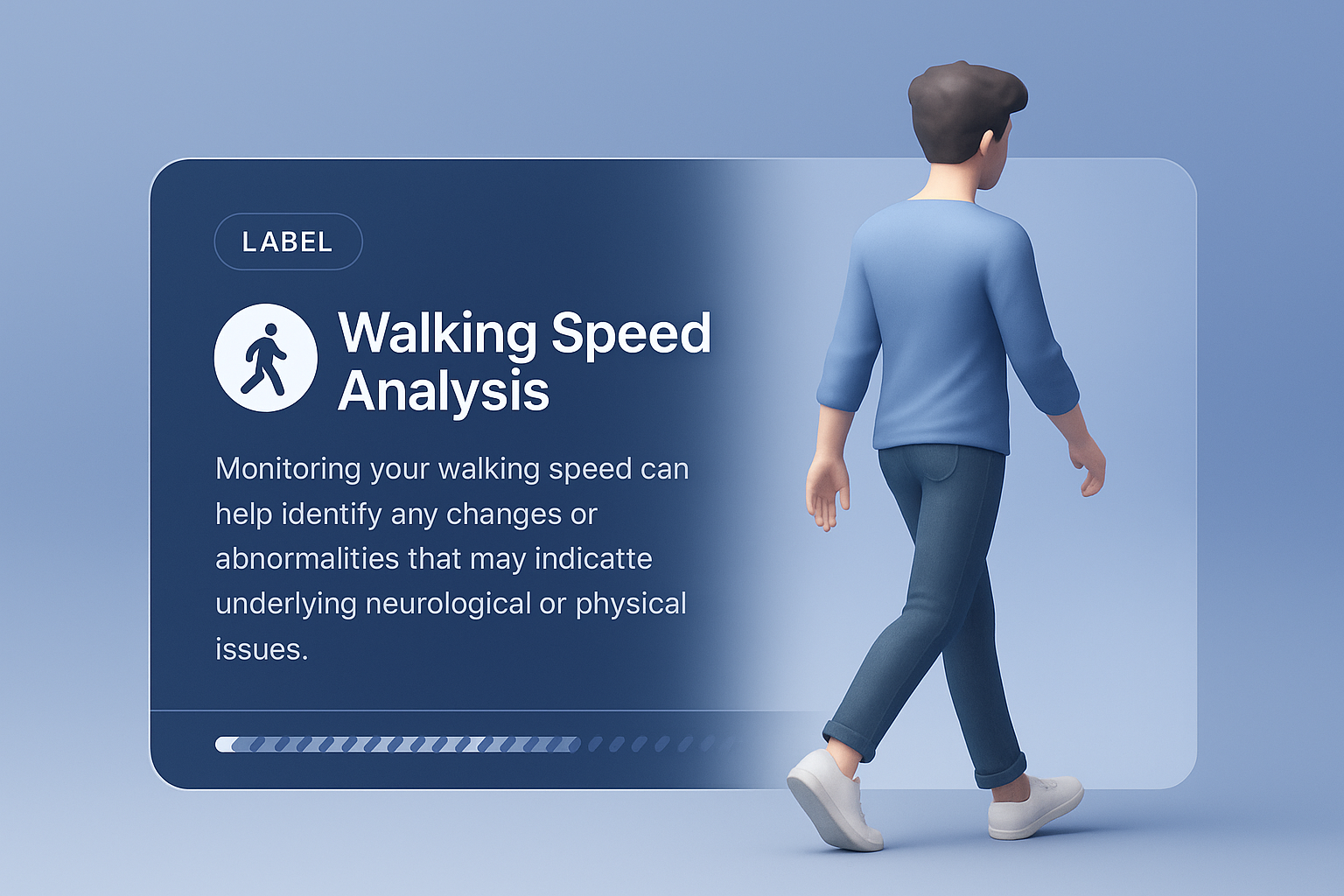 /Collection: /by davooda/Type: PNG/A 3D illustration features a young man walking from the back, accompanied by a transparent interface displaying walking speed analysis. The background has a smooth gradient.