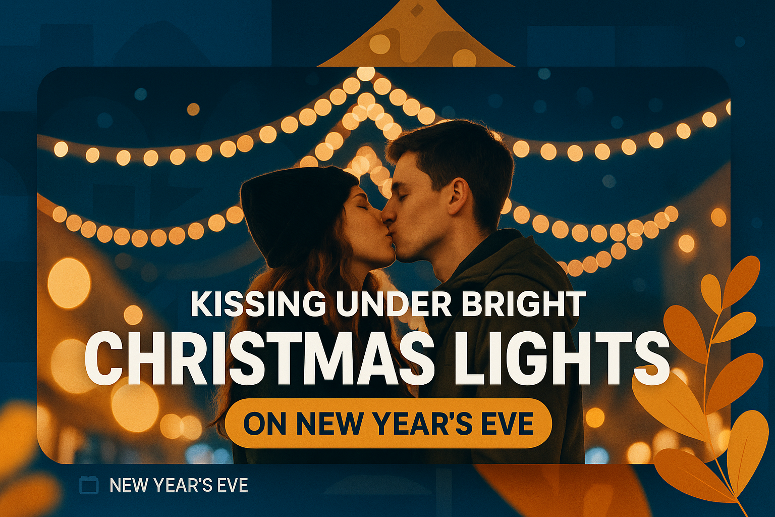 /Collection: /by davooda/Type: PNG/A romantic social media post depicting a couple kissing under bright Christmas lights, perfect for celebrating New Year's Eve. The design features warm colors and festive elements.