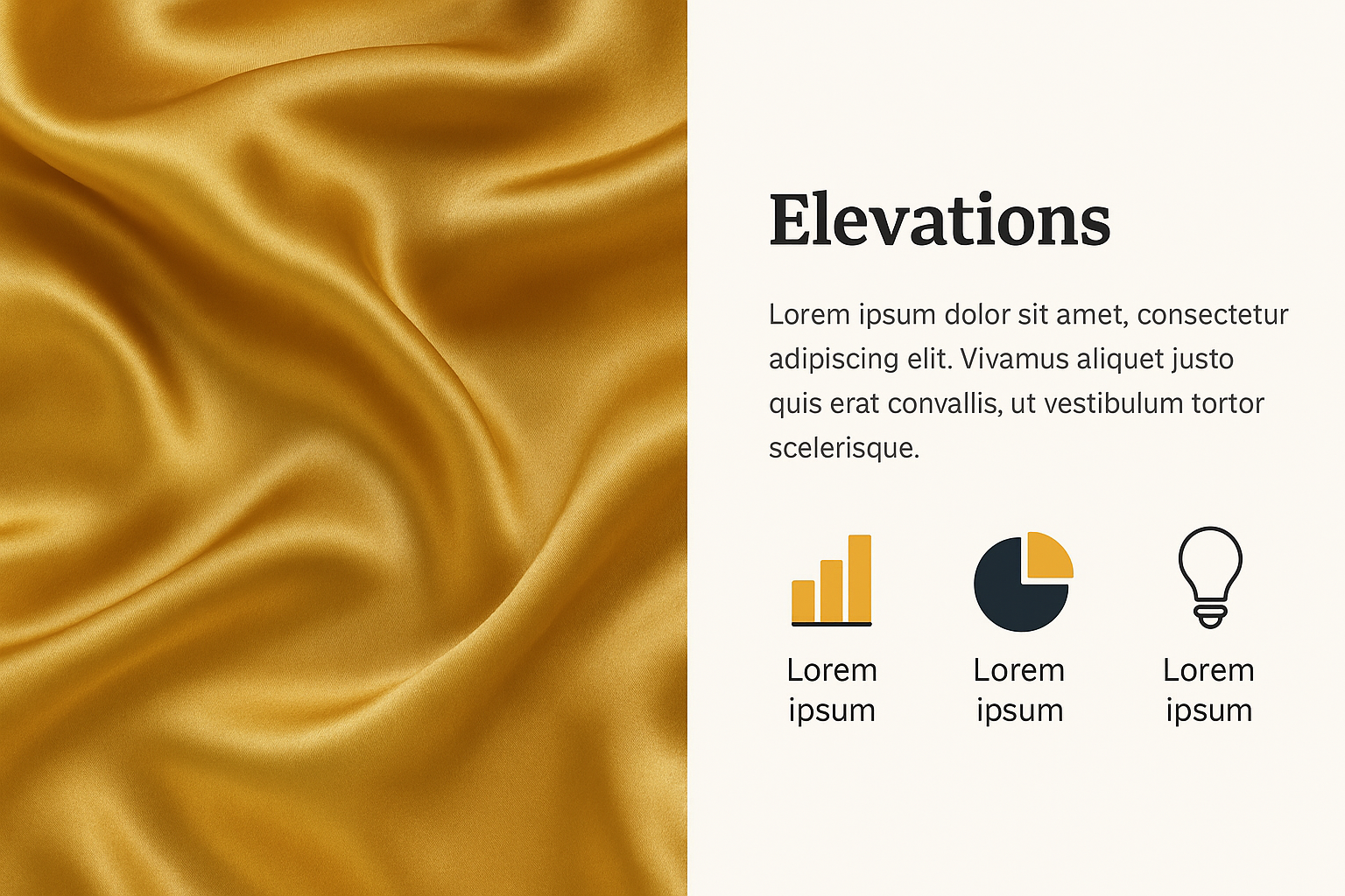 Stylish graphic showcasing a luxurious golden fabric texture alongside informative icons, ideal for presentations or marketing materials.