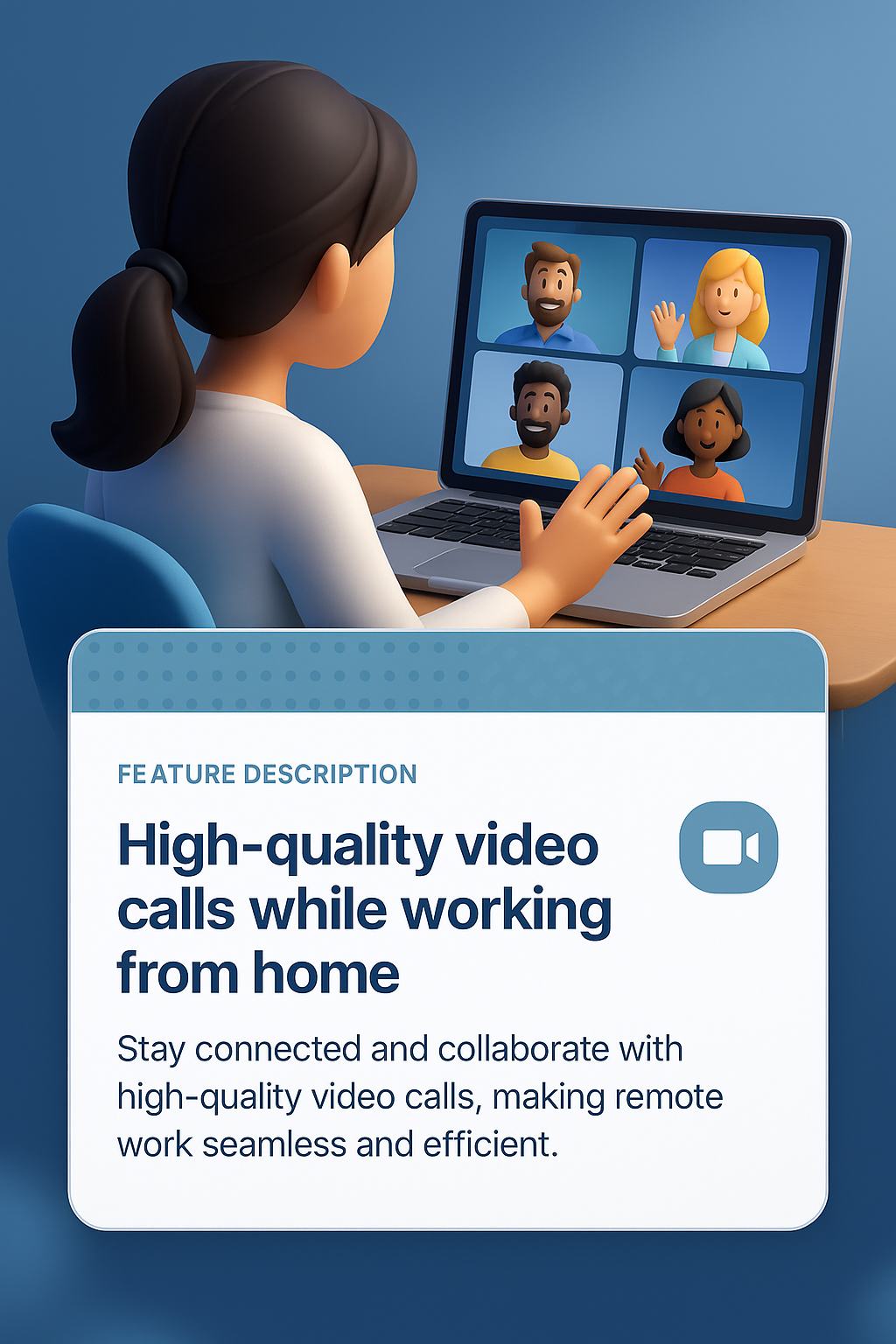 /Collection: /by davooda/Type: PNG/A female employee is seen from the back, engaged in a video call with colleagues on a laptop. The scene emphasizes the concept of remote work, showcasing a professional home environment.