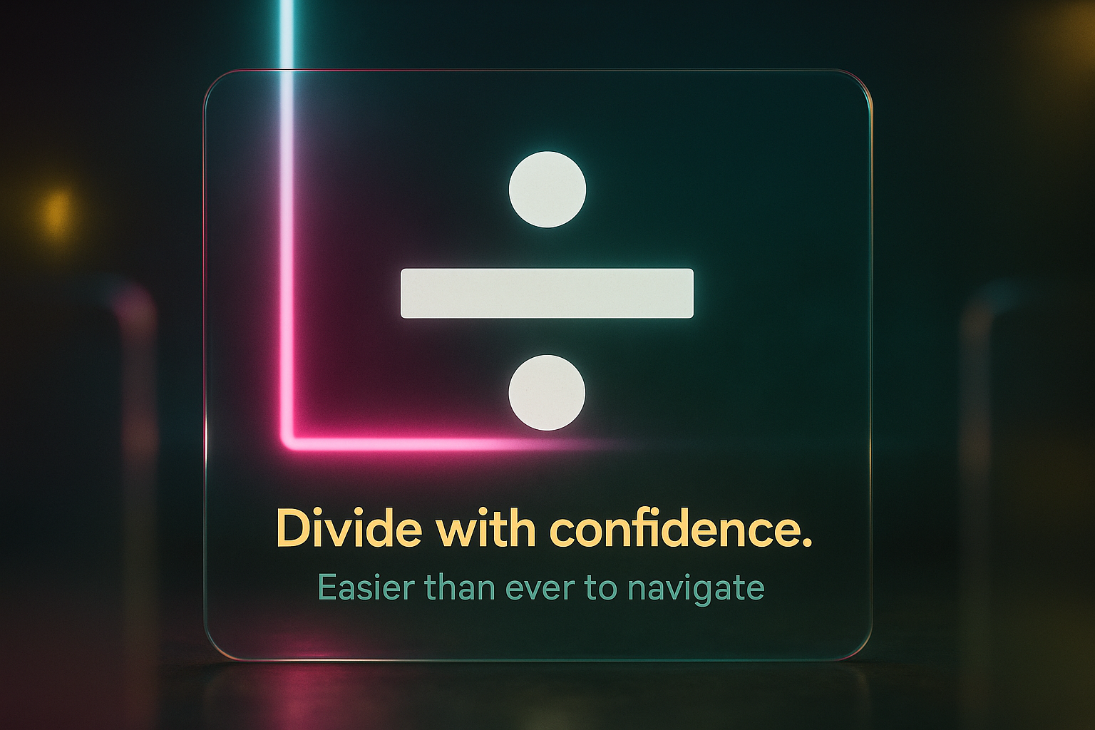 /Collection: /by davooda/Type: PNG/A modern design featuring a neon division symbol on a translucent background. The glowing accents create a captivating atmosphere, emphasizing clarity and confidence in navigation.