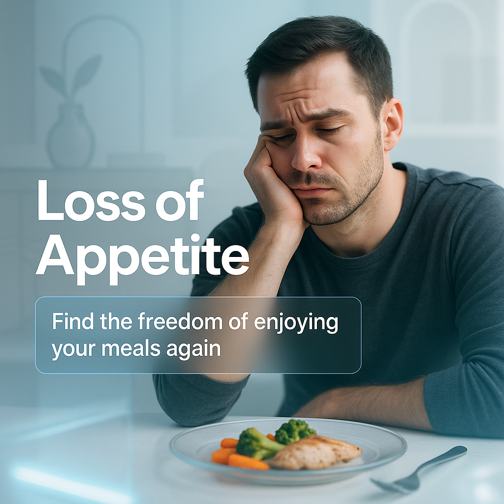 A social media post depicting a man expressing sadness over food, highlighting the theme of loss of appetite. The design is modern and relatable, suitable for health and wellness discussions.