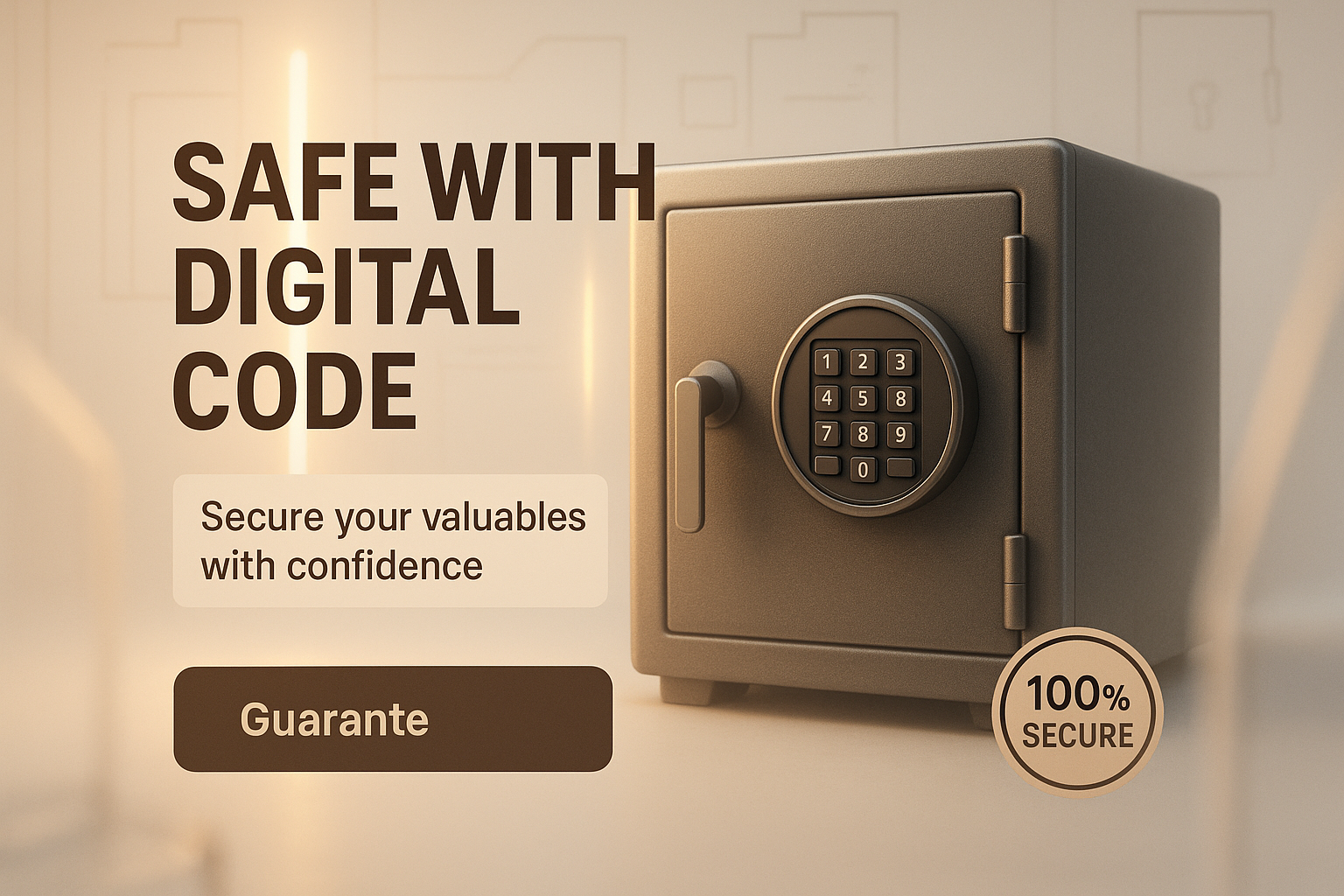 Modern promotional graphic showcasing a digital safe, highlighting security features. Ideal for marketing security products with a sleek and professional design.