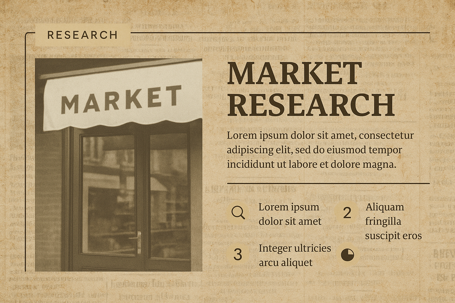 Stylish promotional graphic emphasizing market research with a vintage design theme. Ideal for marketing materials and business presentations.