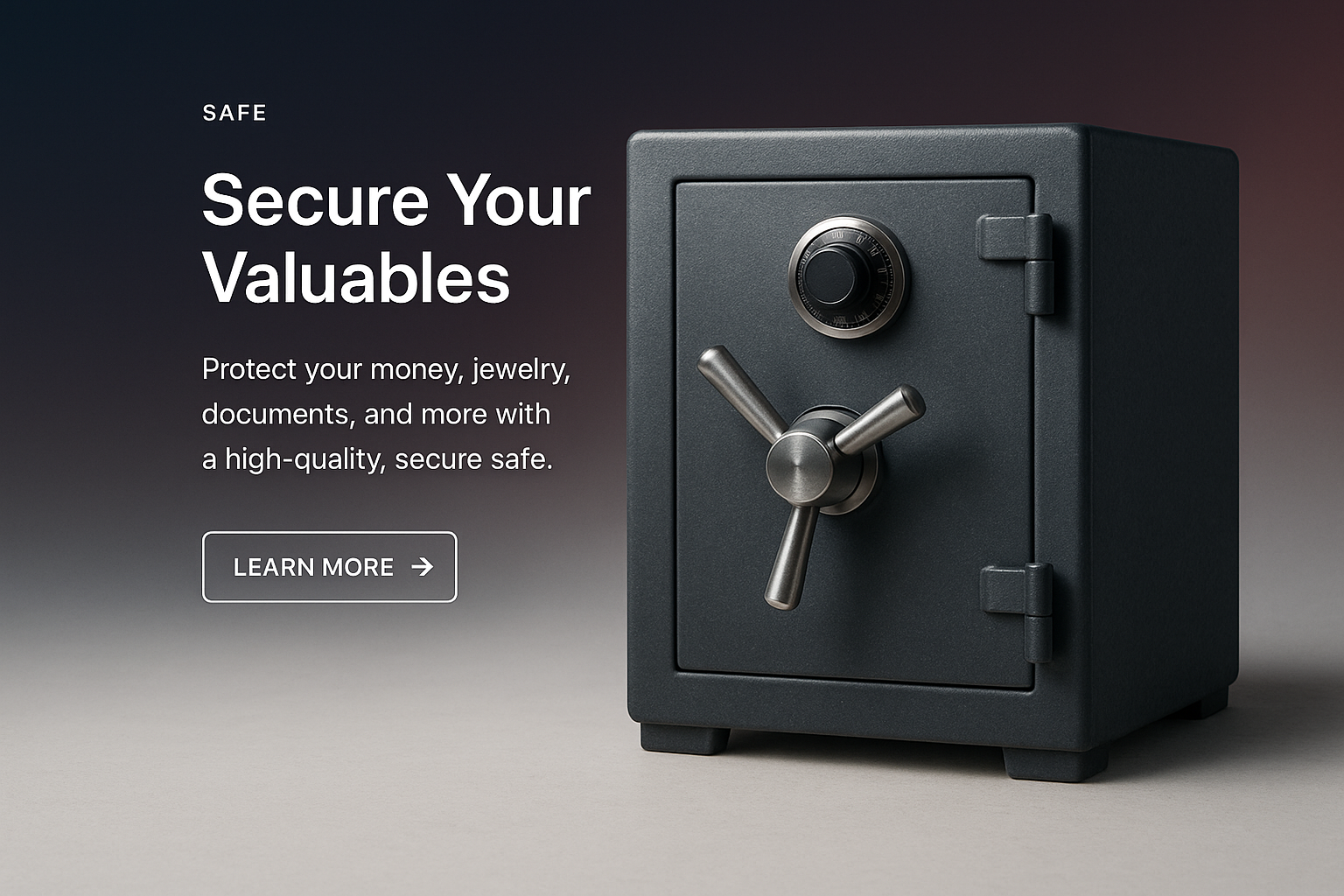 /Collection: /by davooda/Type: PNG/A high-resolution web page mockup featuring a safe with a sleek design. It includes a small label, a concise title, a text block, and a call-to-action button. The background transitions from dark to white, enhancing readability.