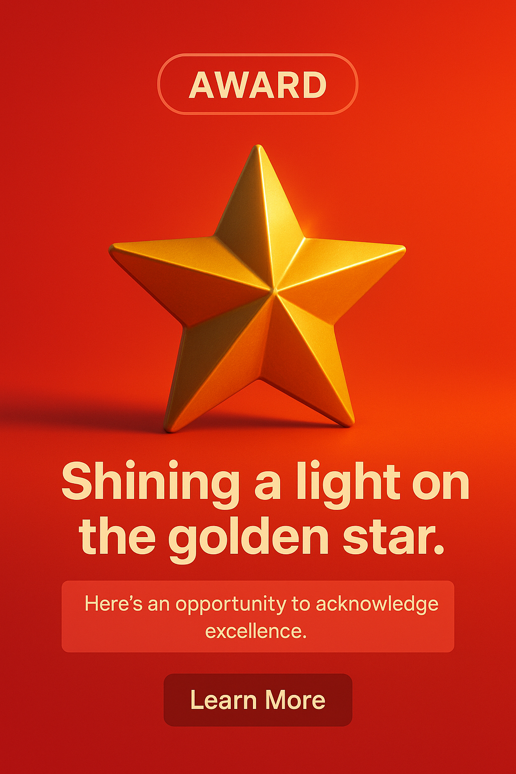 /Collection: /by davooda/Type: PNG/This is a promotional graphic highlighting an award opportunity, featuring a stylized golden star on a vibrant red background. It’s designed for social media or web use.