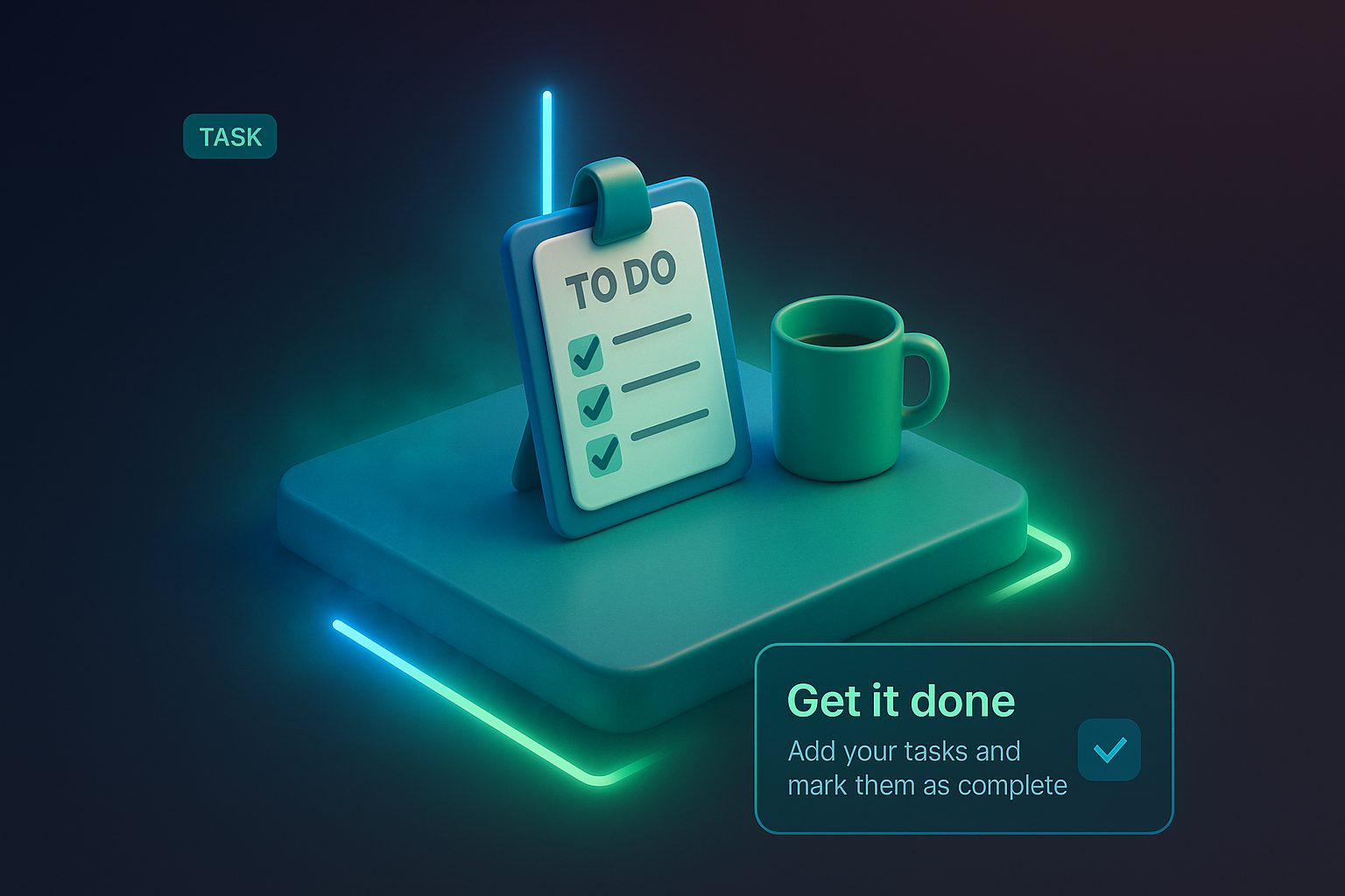 A vibrant, zoomed-out 3D scene featuring a task list, coffee mug, and neon accents. The design includes glowing elements against a dark background, creating a modern atmosphere.