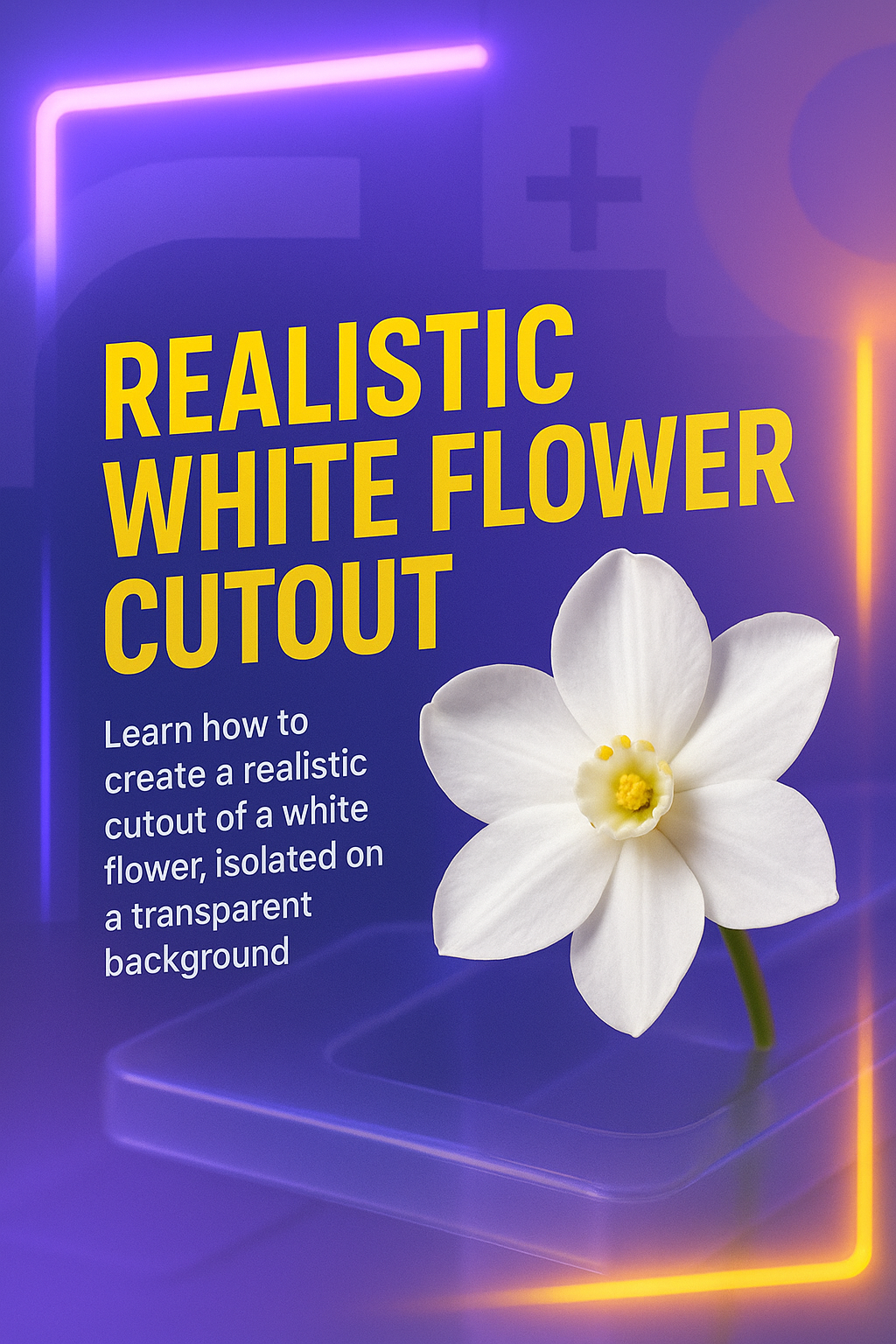 /Collection: /by davooda/Type: PNG/Promotional graphic for a tutorial on creating a realistic white flower cutout. Features vibrant colors and modern design elements, suitable for educational content.