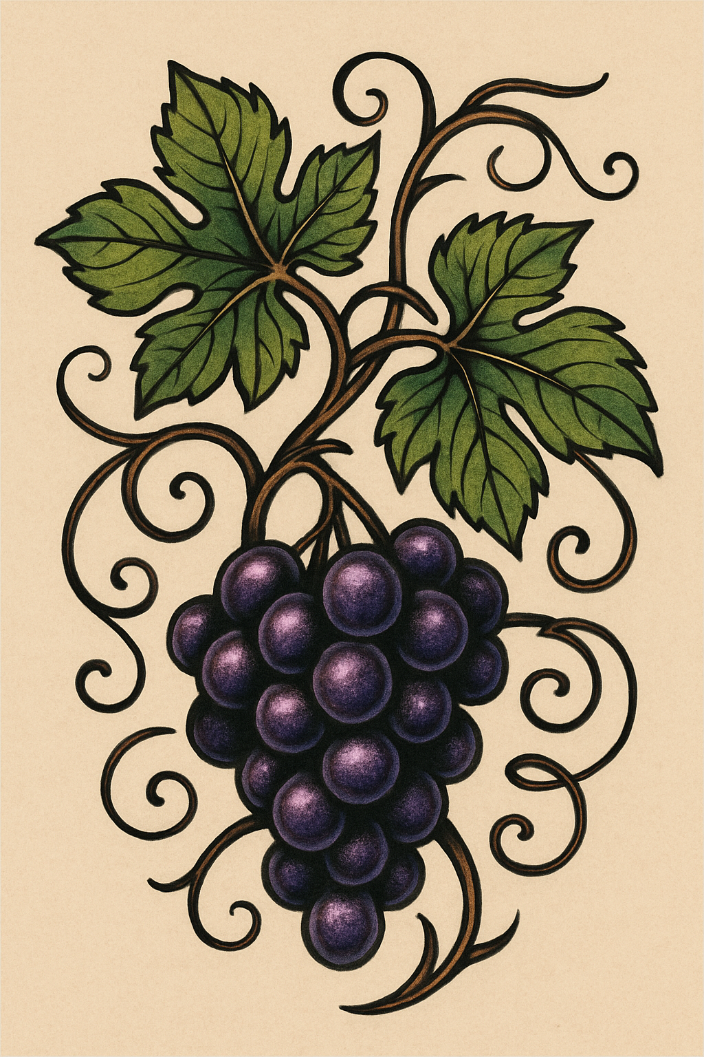 Detailed illustration of grapes with vine and leaves