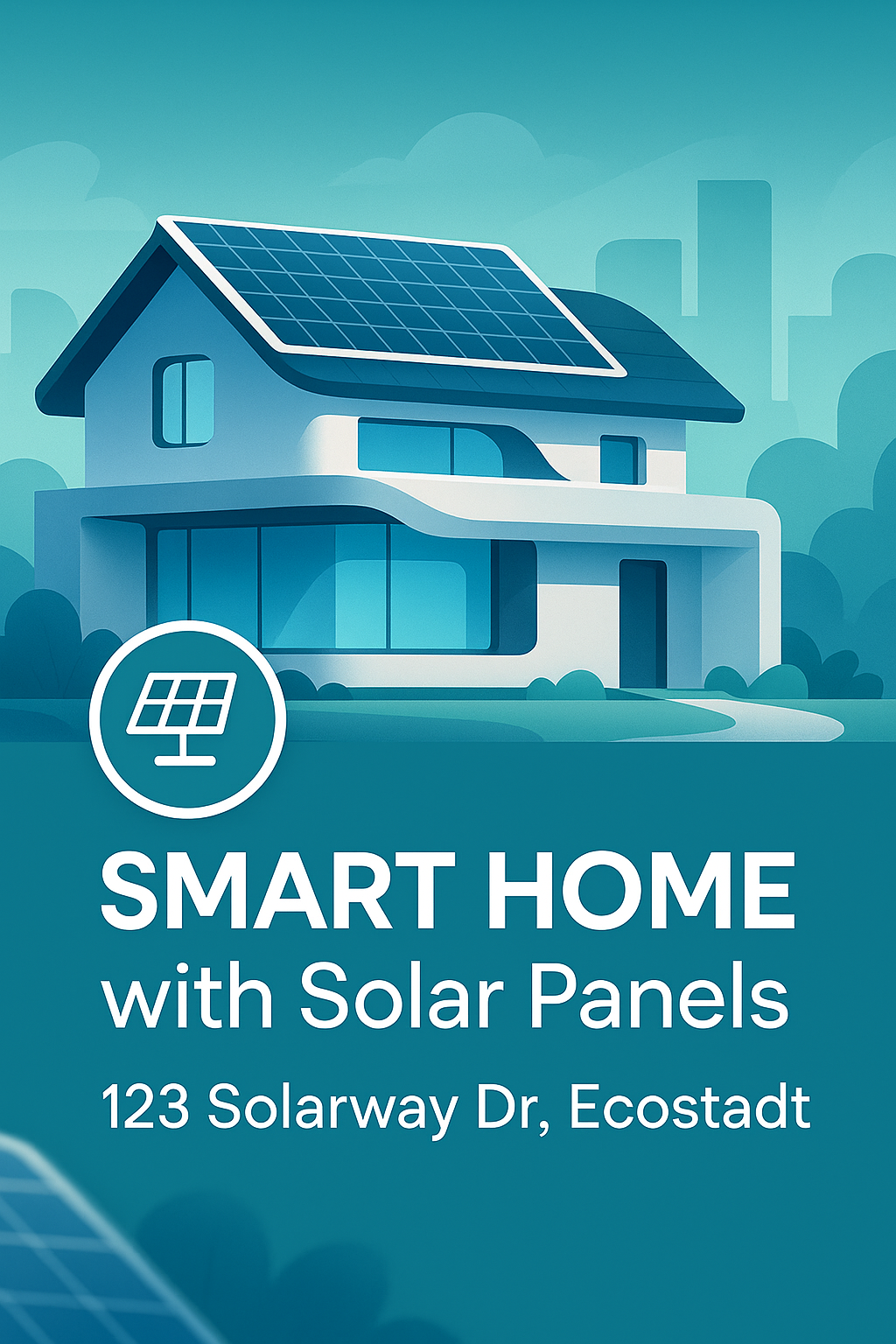 Stylized graphic representation of a modern smart home with solar panels, ideal for eco-friendly housing promotions and sustainability campaigns.