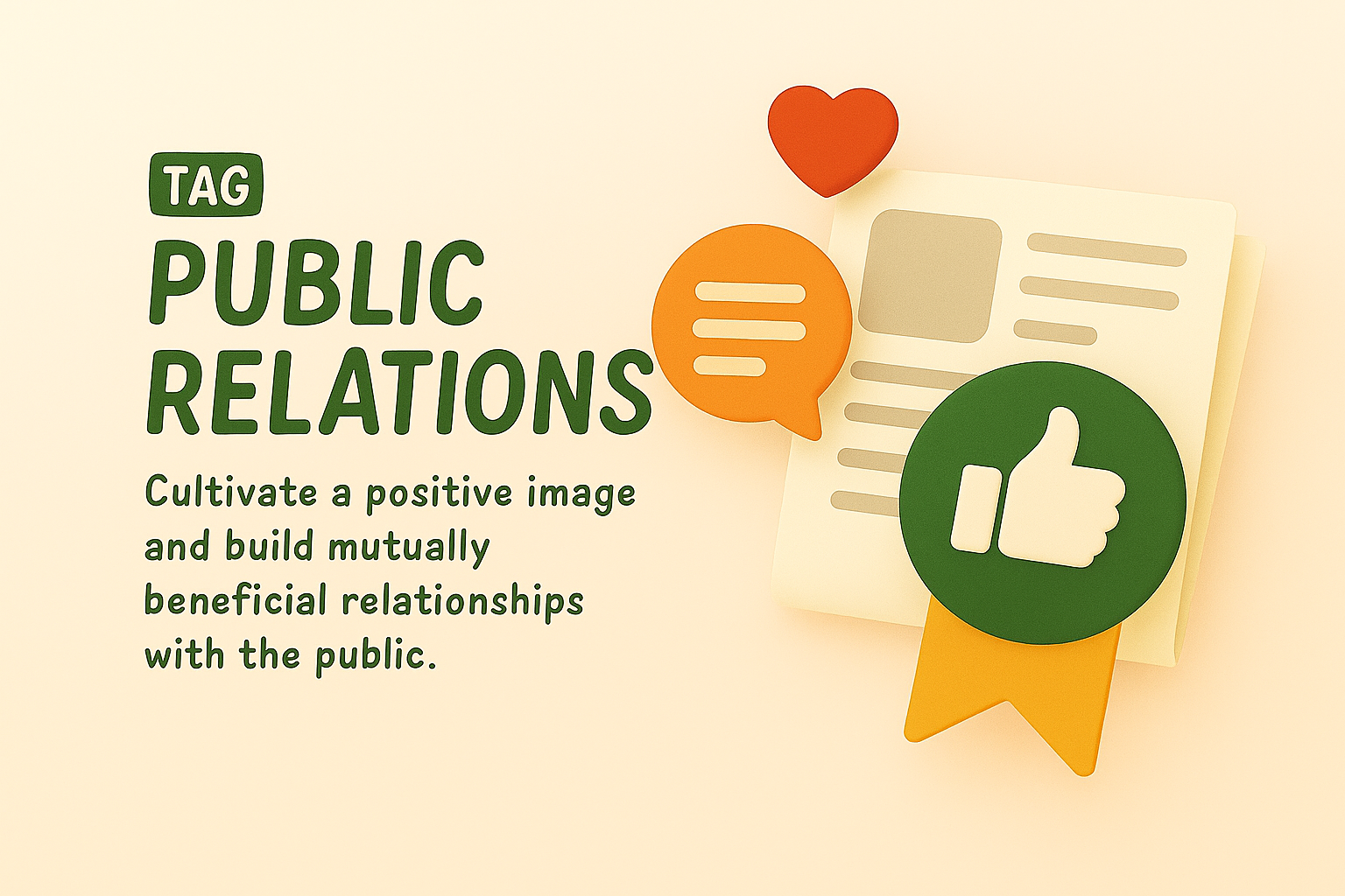 /Collection: /by davooda/Type: PNG/A vibrant graphic illustrating the concept of public relations, featuring playful design elements like speech bubbles and a thumbs-up icon. Ideal for marketing or educational materials.