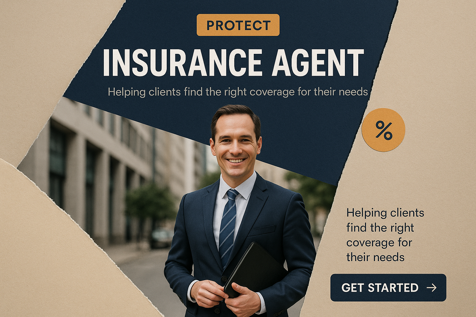 /Collection: /by davooda/Type: PNG/A professional insurance agent stands confidently in a city setting. The image features a layered composition with contrasting colors, a clear call-to-action button, and supporting text, all aimed at engaging clients.