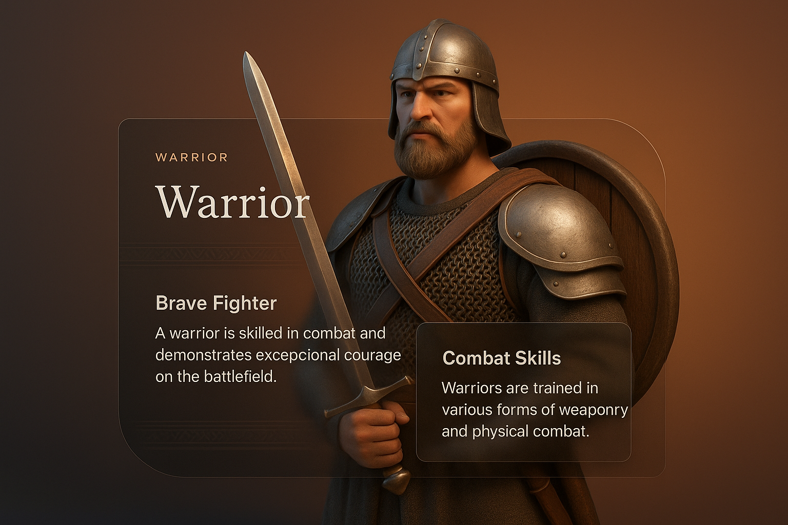 /Collection: /by davooda/Type: PNG/A detailed 3D illustration of a warrior holding a sword, integrated with a transparent overlay showcasing skills and attributes. The background transitions from gradient to solid color.