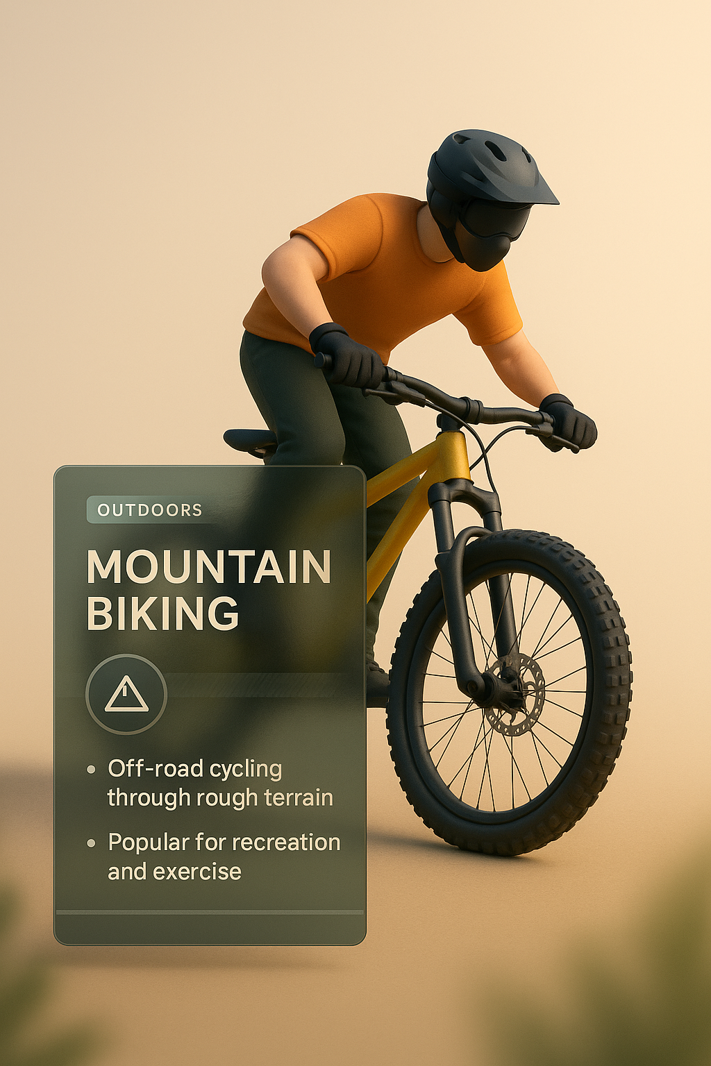 /Collection: /by davooda/Type: PNG/A vibrant 3D illustration of a mountain biker navigating rough terrain, complemented by a sleek informational overlay. The design features a gradient background and a visually appealing label.