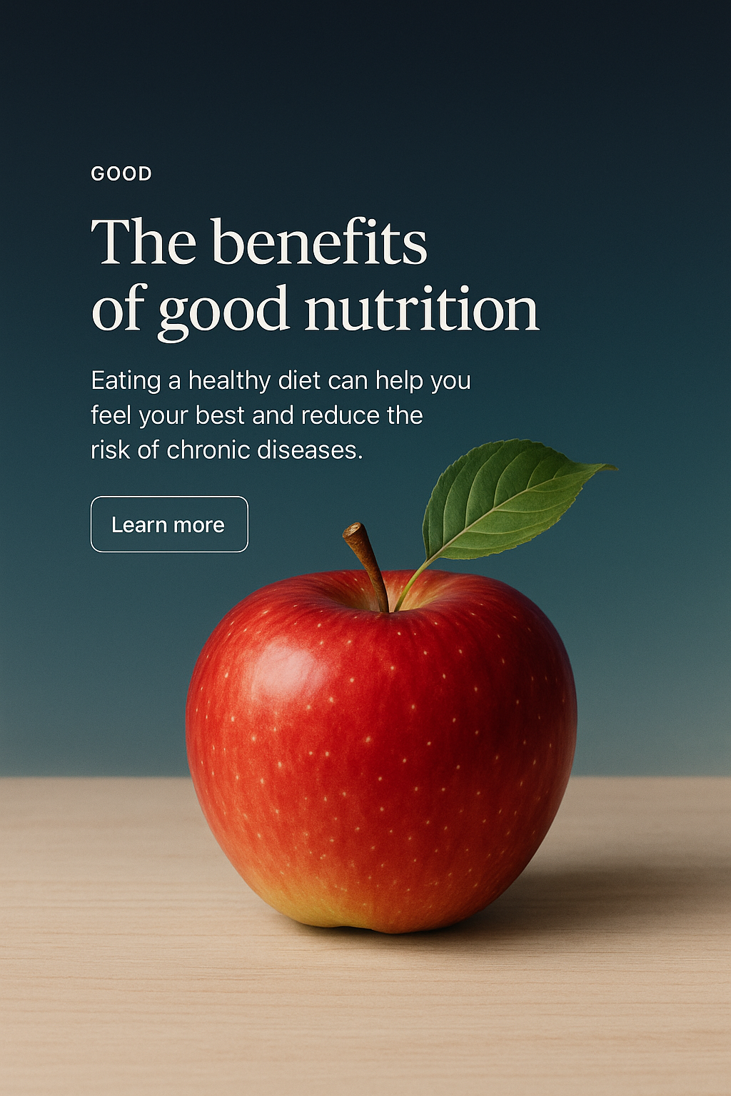 An engaging web design mockup showcasing a vibrant red apple with a gradient background. The layout includes concise text highlighting the benefits of good nutrition and a prominent action button.
