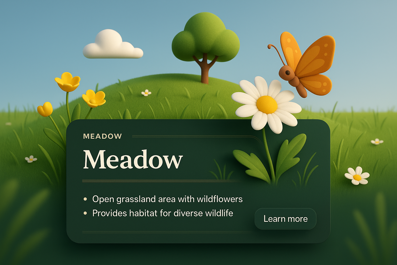 /Collection: /by davooda/Type: PNG/A beautifully rendered 3D illustration of a meadow featuring wildflowers, a butterfly, and a tree, complemented by an integrated information block with a dark theme.