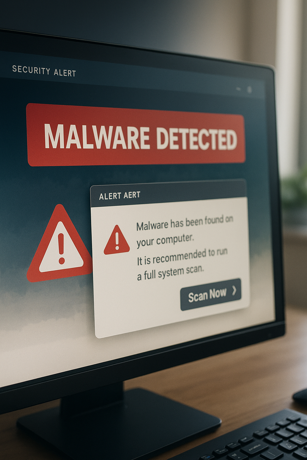 A computer screen displays a malware alert with a clear warning and action button. The design features a gradient background and emphasizes realism in digital layout.