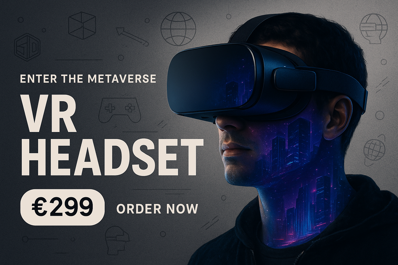 /Collection: /by davooda/Type: PNG/A visually striking advertisement featuring a VR headset immersed in a futuristic metaverse. The design balances a realistic object with a textured background, incorporating bold typography and a price tag.
