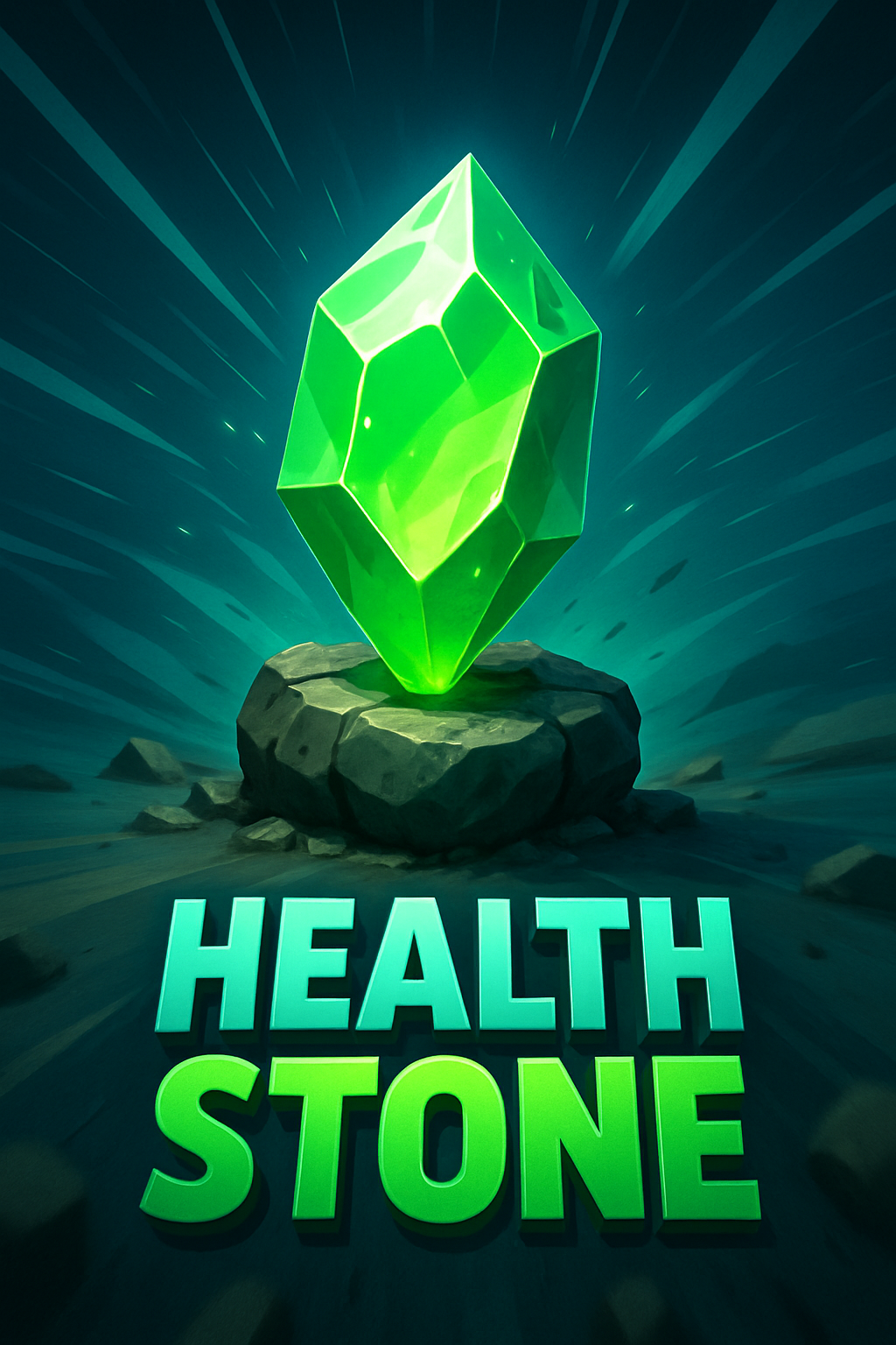 /Collection: /by davooda/Type: PNG/A striking 3D illustration of a vibrant green health stone, placed on a rocky base. The energetic background features dynamic rays emanating from the center, creating a sense of movement and vitality.