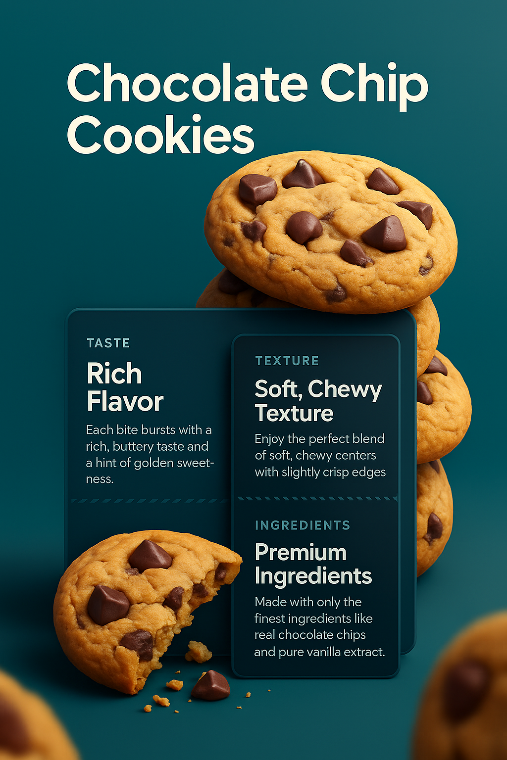 A visually appealing 3D composition of chocolate chip cookies, showcasing their rich flavor and soft texture. The design features a smooth gradient background, with text blocks detailing taste and ingredients.
