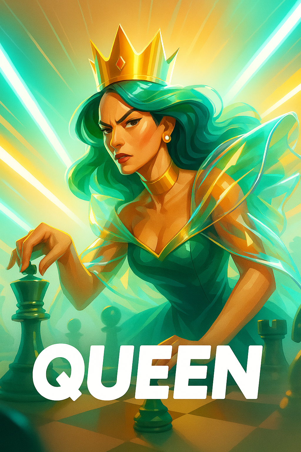 /Collection: /by davooda/Type: PNG/A vibrant illustration featuring a queen with flowing teal hair, adorned with a crown. The scene is illuminated by neon lights and dynamic rays, creating a captivating atmosphere.