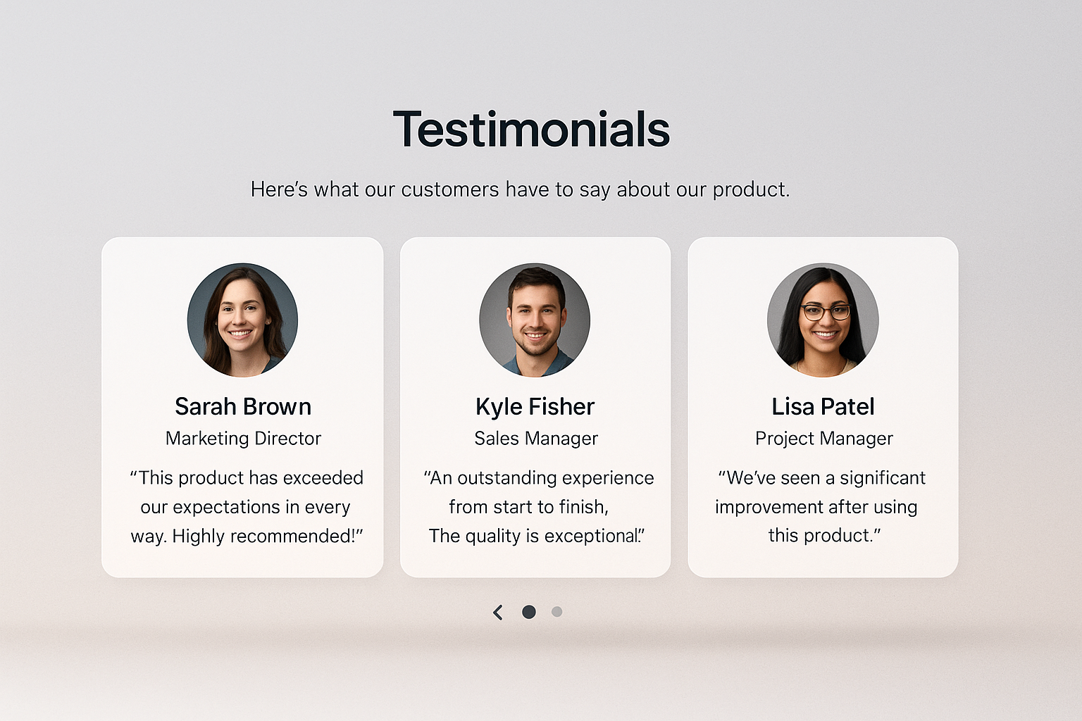 /Collection: /by davooda/Type: PNG/A visually engaging testimonials section featuring three cards with author photos, names, positions, and quotes. The design integrates smoothly with a cohesive color scheme.