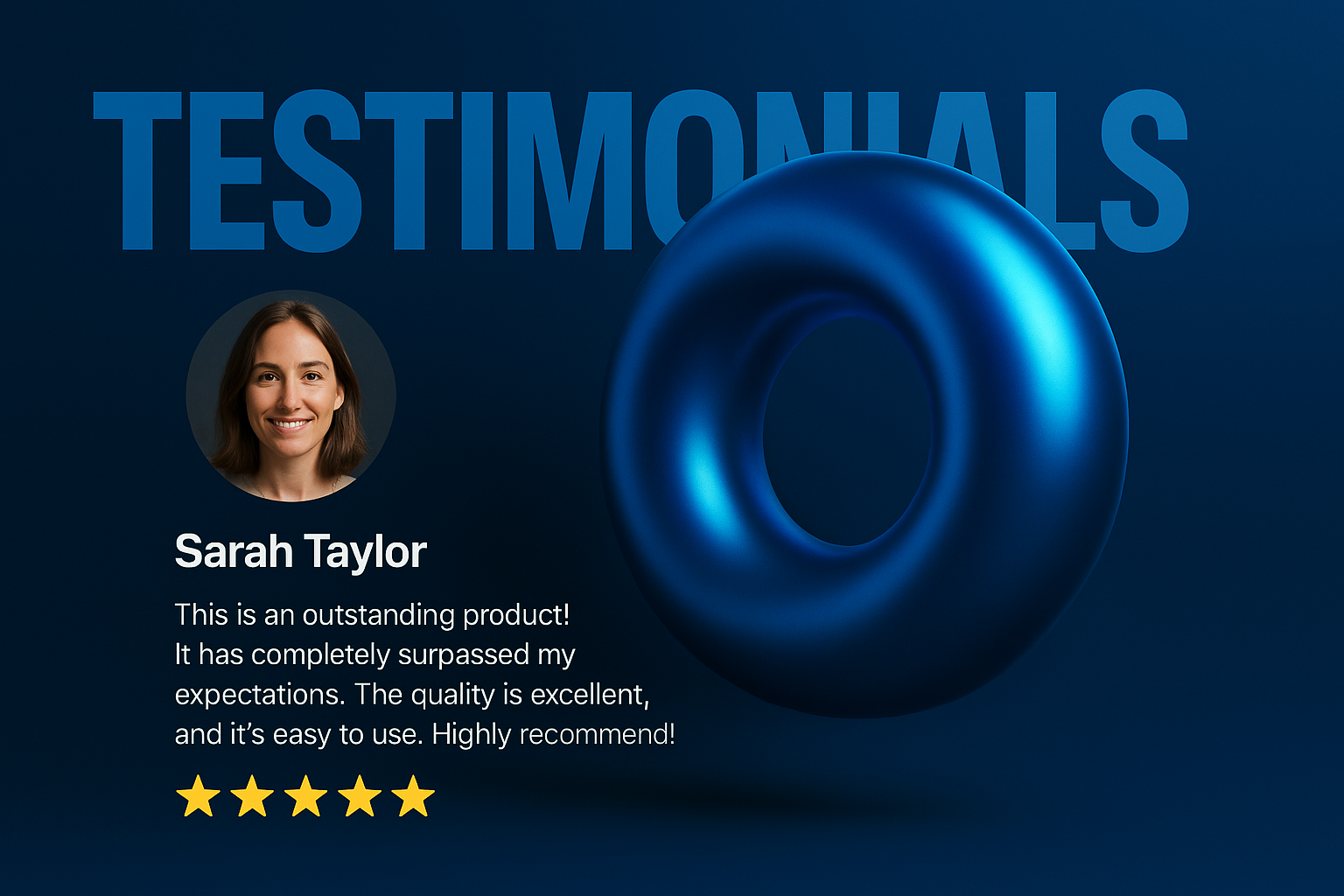 /Collection: /by davooda/Type: PNG/A striking testimonial layout featuring a circular photo of a user, bold typography, and a large 3D object against a modern blue gradient background. The design emphasizes clarity and modernity.