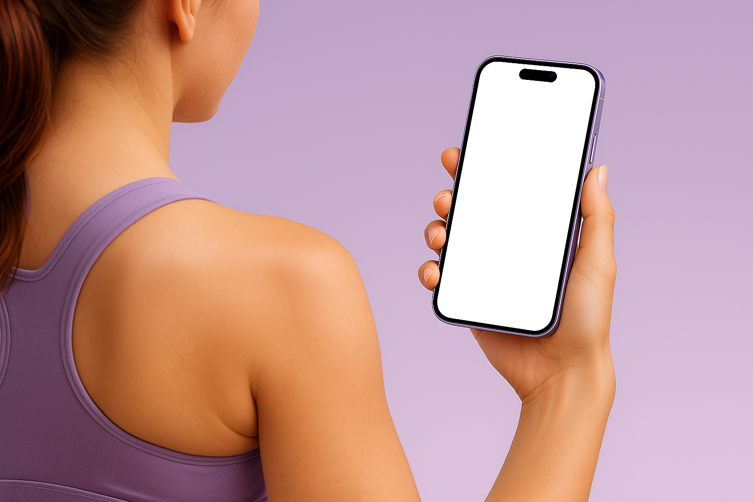A sporty woman in a purple outfit is holding a sleek phone with a white screen. The image captures her from behind, emphasizing her athletic build against a soft purple background.