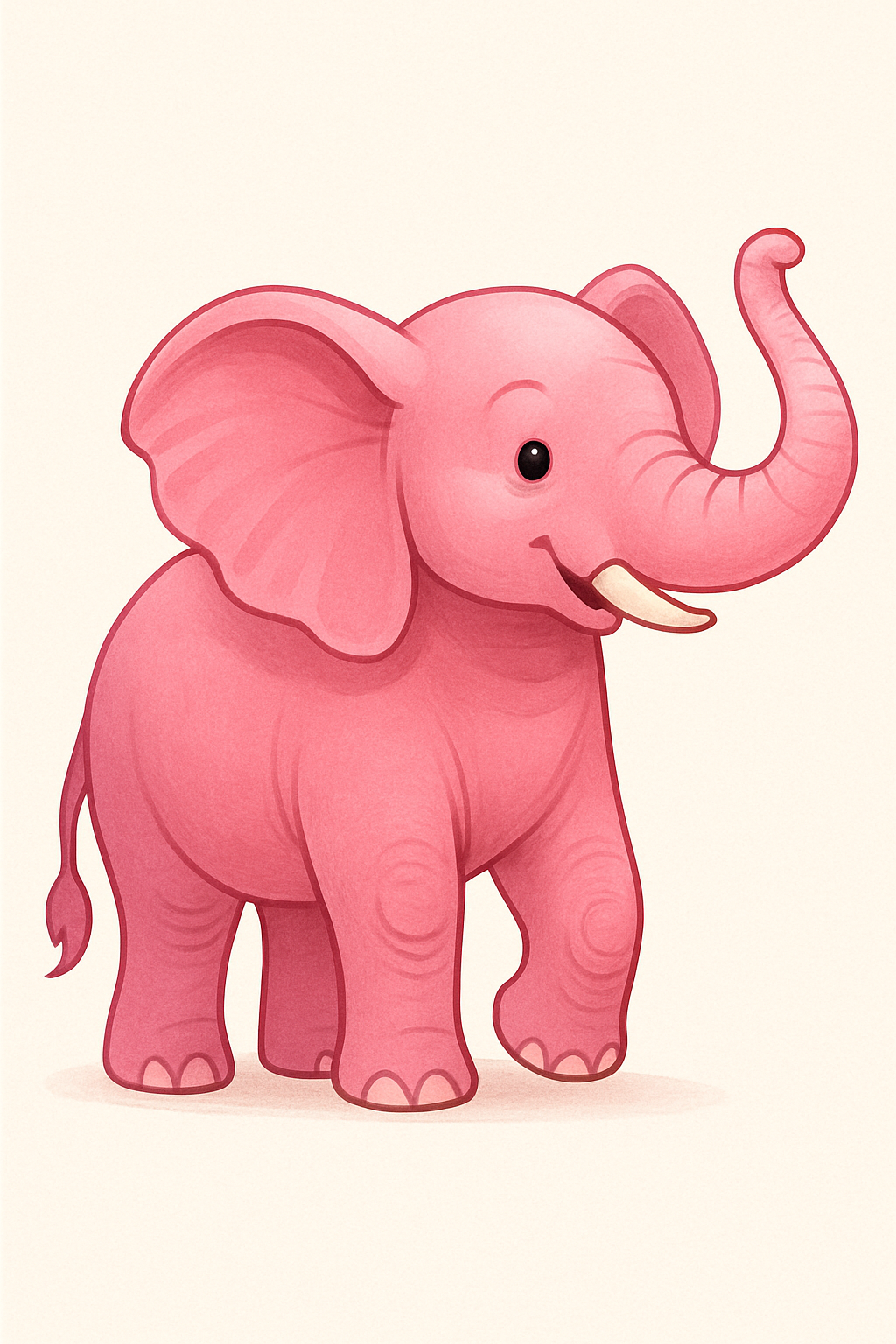Adorable illustration of a pink elephant, designed with a playful cartoon style. Ideal for children's books, educational materials, or playful branding.