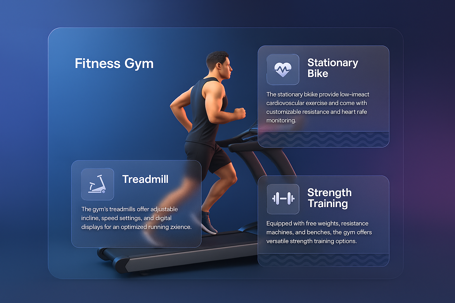 /Collection: /by davooda/Type: PNG/This infographic showcases gym equipment, including a stationary bike and treadmill, highlighting their features and benefits for users. Ideal for fitness enthusiasts.