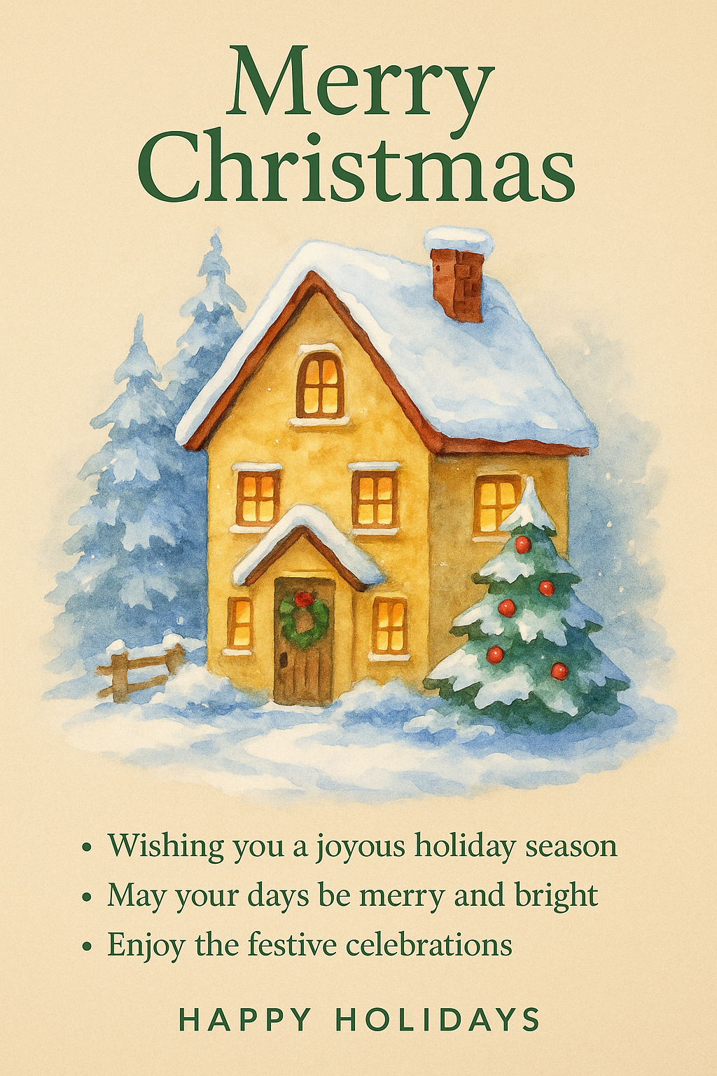 A festive holiday greeting card featuring a snowy cottage and pine tree, perfect for conveying warm wishes during the Christmas season. The watercolor style adds a cozy charm.