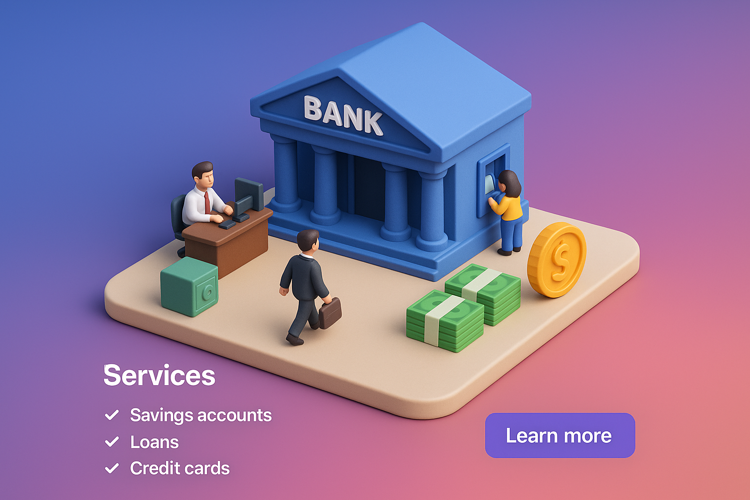 /Collection: /by davooda/Type: PNG/A vibrant 3D illustration of a small bank scene featuring tiny characters engaging with the bank's services. The background smoothly transitions in color, enhancing the overall realism and focus on the bank's offerings.