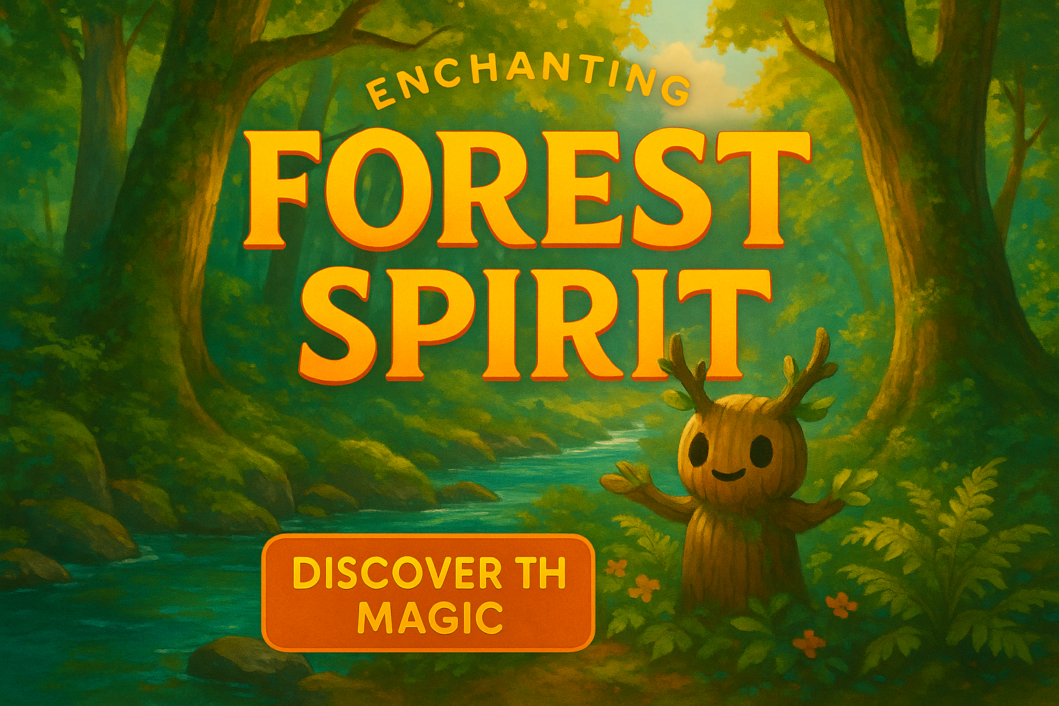 /Collection: /by davooda/Type: PNG/A vibrant illustration featuring a charming forest spirit beside a serene stream, with warm colors and engaging typography that invites viewers to discover its magic.