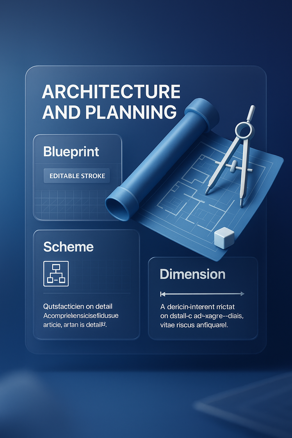 A visually appealing 3D illustration featuring architectural planning elements, including a blueprint, compass, and grid. The design highlights editable strokes and a modern aesthetic.