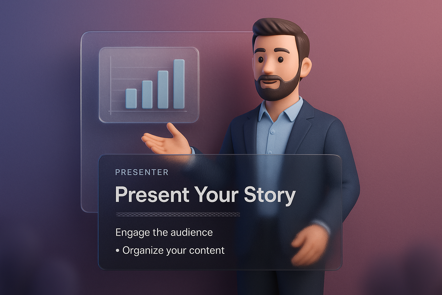 /Collection: /by davooda/Type: PNG/A 3D illustration featuring a presenter engaging with the audience. The scene includes a graphical element and a transparent overlay with text, showcasing a modern web design concept.