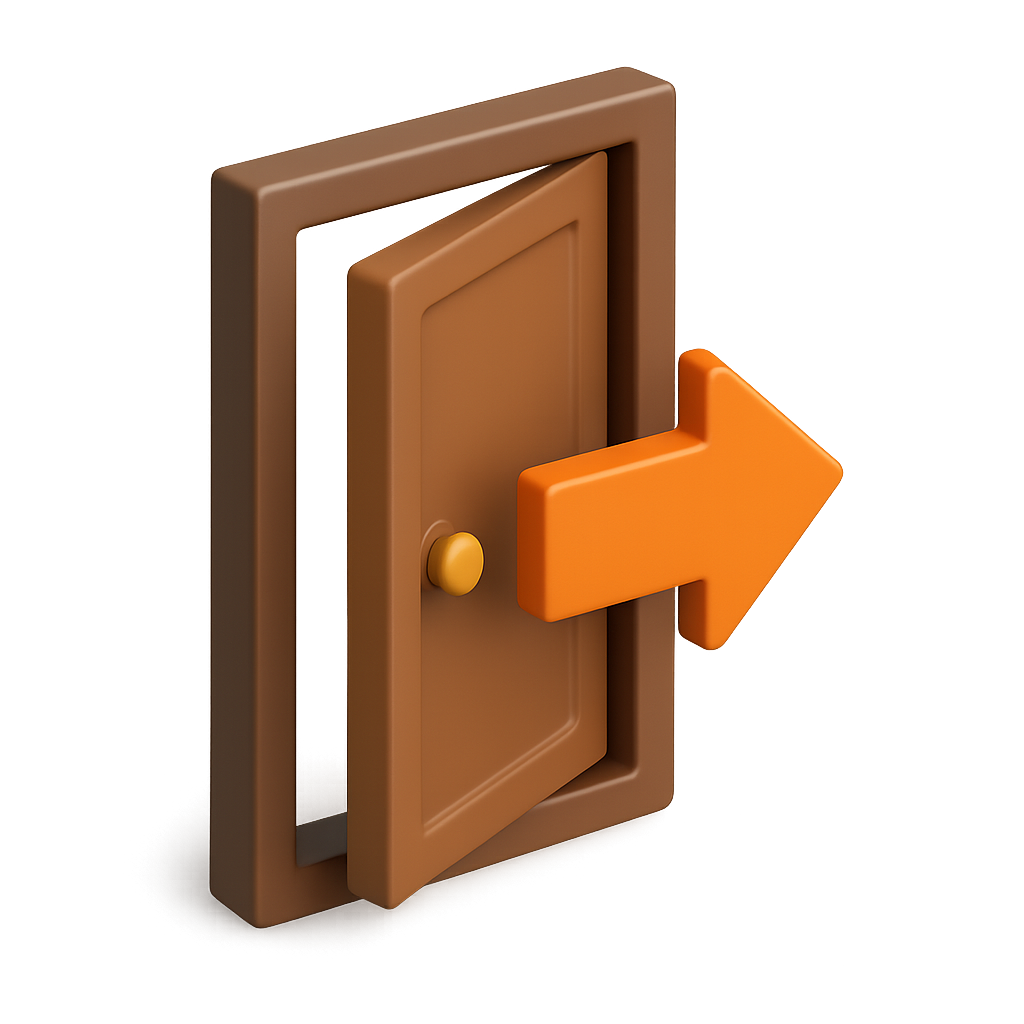 A creatively designed 3D backdoor icon featuring a brown door slightly ajar with an orange arrow pointing outward, evoking a sense of movement and accessibility.