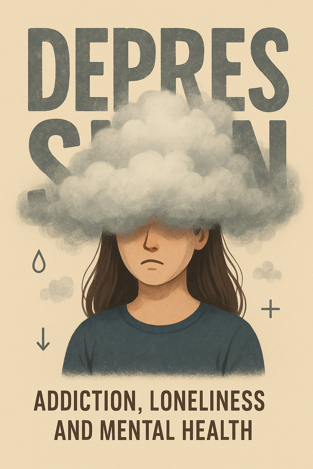 /Collection: /by davooda/Type: PNG/A thought-provoking illustration addressing addiction, loneliness, and mental health, featuring a figure with a cloud obscuring their head, creating a visual metaphor for emotional struggles. Ideal for educational or awareness campaigns.
