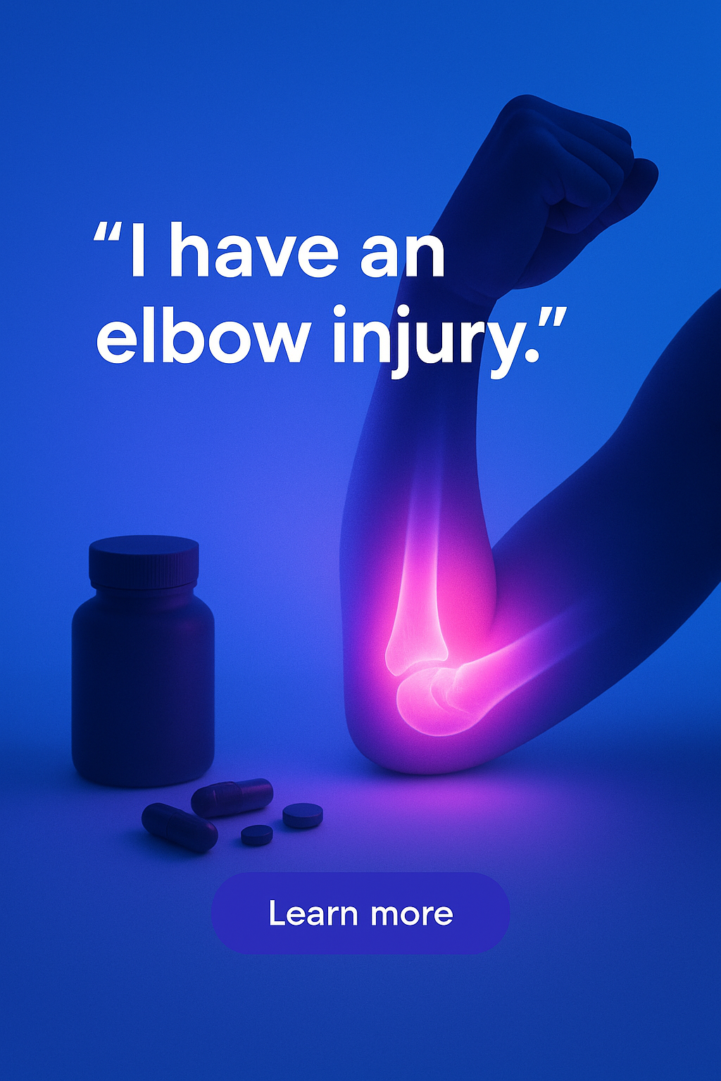 /Collection: /by davooda/Type: PNG/The image features a glowing elbow against a solid blue background, highlighting an injury. A bottle and pills complement the visual, creating a cohesive theme of health and awareness.