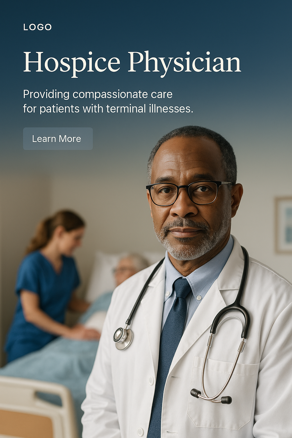 /Collection: /by davooda/Type: PNG/A professional web design concept featuring a hospice physician. The layout includes a logo, title, and text block highlighting compassionate care, alongside an action button.